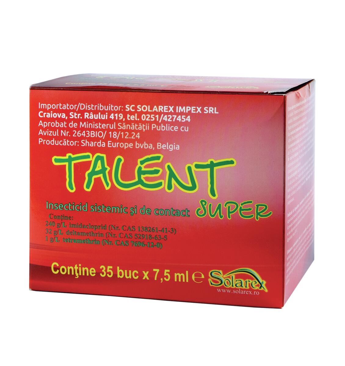 Talent Super este un insecticid cu dublă acţiune, sistemică şi de contact (de şoc) şi remanenţă îndelungată, sub formă de concentrat emulsionabil de culoare albă. Substanţele active, imidacloprid, deltamethrin şi tetramethrin conţinute de insecticidul Talent Super, acţionează prin contact şi ingestie asupra dăunătorilor.