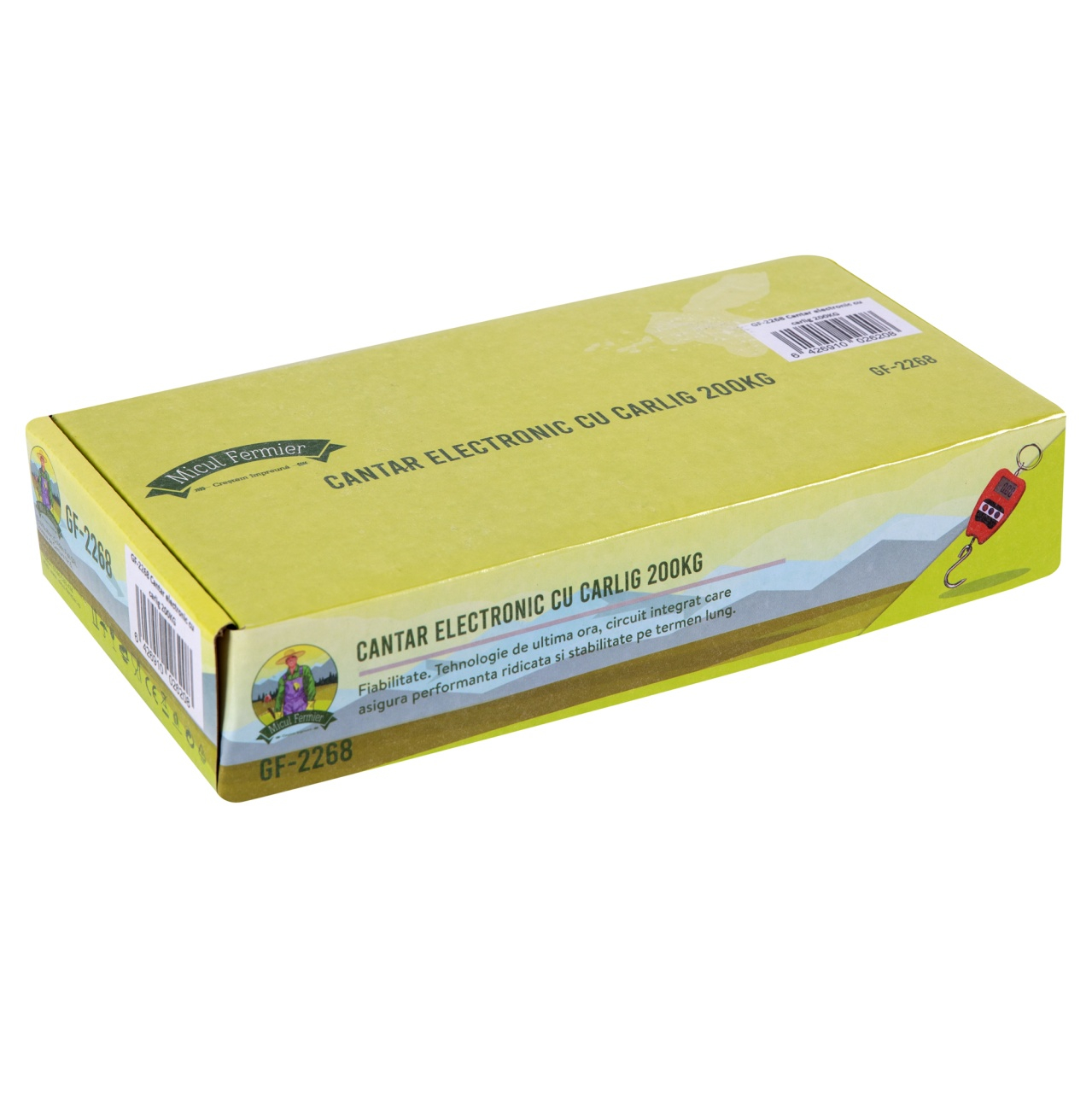 Cantarul electronic de mana 200KG, Micul Fermier GF-2268 este echipat cu un display LCD, iluminat din interior, ce afiseaza informatii cu privire la greutate. Datorita carcasei robuste, a sistemului de prindere si a carligului din otel, cantarul electronic de mana cu carlig 200 kg, Micul Fermier GF-2268 este rezistent la deteriorari accidentale, precum ciobiri sau zgarieri, dar si usor de curatat.Cantarul este dotat cu 3 taste. Tastele permit pornirea si oprirea dispozitivului, setarea tarei, selectarea unitatilor de masura (kg, lb sau N) si blocarea indicatiilor cantarului. Punctele forte ale cantarului Micul Fermier GF-2268 sunt:•display LCD usor de citit oprire automata;•cantarul este oprit automat dupa 3 minute pentru a economisi bateria program de cantarire a animalelor;•vibratiile sunt filtrate, astfel puteti obtine greutatea stabila. Cantarul electronic de mana Micul Fermier GF-2268 are capacitate maxima de cantarire de 200kg. Continut colet cantar electronic de mana 200KG, Micul Fermier GF-2268•Continut pachet;•Echipament;•Manual;•Carlig;•Baterie.