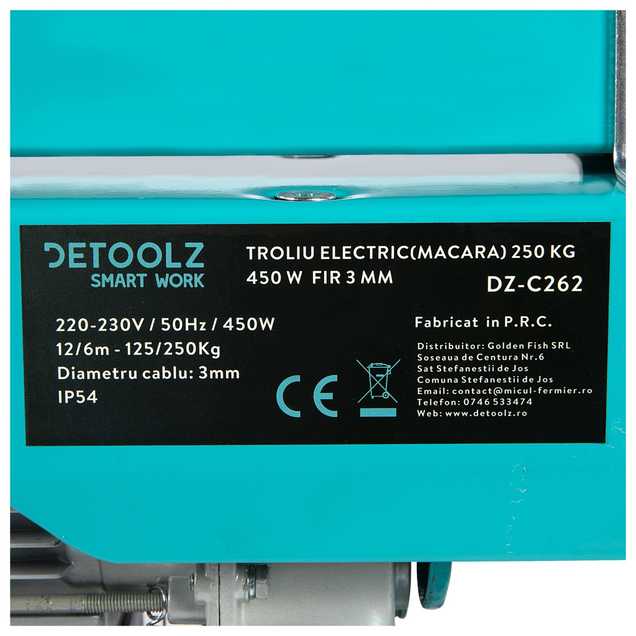 Troliu electric (macara) 250kg, 450W, diametru fir 3mm, Detoolz DZ-C262 este destinat ridicarii obiectelor cu greutate mare fiind utilizat pe scara larga in diverse domenii: pentru construirea si renovarea locuintelor, cat si pentru serviceurile mecanice.Caracteristici troliu electric (macara) 250kg, 450W, fir 3mm, Detoolz DZ-C262:• Troliul electric Detoolz DZ-C262 are o putere de 450W, o capacitate de ridicare de 125 kg (linie simpla) si o capacitate de ridicare de 250 kg (linie dubla);• Troliul electric Detoolz DZ-C262 are o inaltime de ridicare de 6 m - 250 kg / 12 m - 125 kg;• Troliul electric Detoolz DZ-C262 are diametrul firului de 3 mm si o viteza de ridicare de 4 m / minut - 250 kg si 8 m / minut - 125 kg; Continut colet:• Troliu electric;• Manual de instructiuni;• Cutie de transport.*Suportul DZ-C264 se achizitioneaza separat.*Bara verticala suport (Suportul DZ-C264 ) este cu titlu de prezentare si nu este inclusa in colet.
