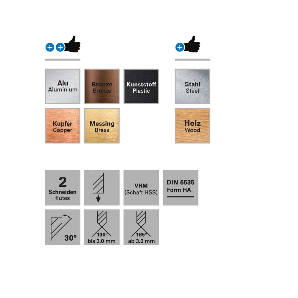 Aceste burghie fabricate din micro-carburi au doua canale de evacuare si directie de aschiere in jos. Aceste unelte pentru aschiere cu o durata mare de viata, sunt disponibile cu diverse diametre ale varfului, ale axului se prindere sau lungimi ale partii active.