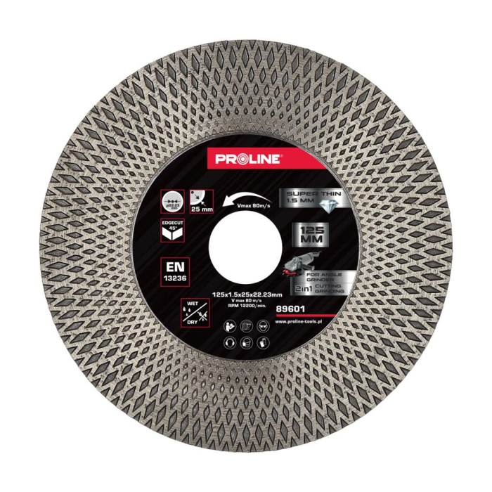 • Destinat pentru efectuarea de tăieturi precise, cu o finisare netedă a marginilor, teșire la unghi de 45° și șlefuire. Discul ideal pentru tăierea și șlefuirea plăcilor ceramice dure și a plăcilor din piatră naturală: faianță, gresie, marmură, granit etc.