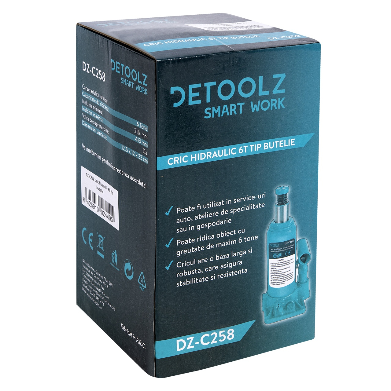 Cricul hidraulic auto 6T de tip butelie Detoolz DZ-C258 are o capacitate de ridicare de maxim 6 tone.Poate fi utilizat in service-urile auto, ateliere de specialitate sau in gospodarie. Cricul hidraulic auto 6T de tip butelie Detoolz DZ-C258 poate ridica vehicule foarte grele, insa trebuie manipulat conform instructiunilor pentru a preveni accidentele. Datorita formei unice a cricurilor hidraulice de tip butelie alegerea dimensiunii corecte este cruciala, acestea trebuie sa fie destul de mici pentru a incapea sub vehicul si destul de puternice pentru a-l ridica in siguranta. Avantaje cricul hidraulic auto 6T de tip butelie Detoolz DZ-C258:• Constructie robusta, din materiale de fabricatie de cea mai buna calitate, usoare si rezistentepentru o durata de viata extinsa;• Ideal pentru situatii de urgenta;• Recomandat pentru ridicarea greutatilor mari, fara efort si in conditii de siguranta. Beneficii client:• Usor de instalat;• Usor de manevrat;• Usor de depozitat;• Greutate redusa. Continut colet:• Cric hidraulic de tip butelie;• Manual cu instructiuni de utilizare;• Cutie transport.