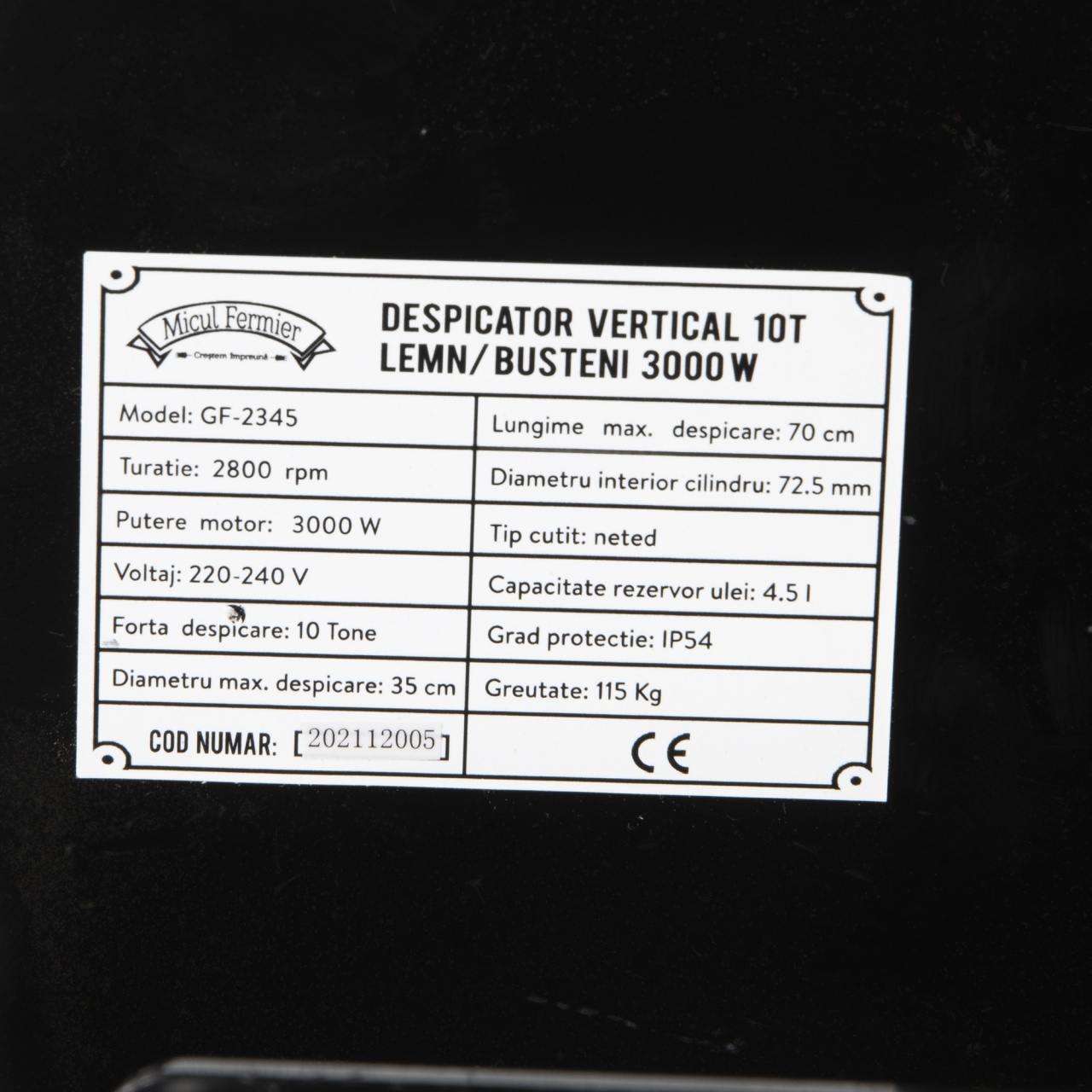 Despicatorul busteni/lemne vertical, 3000W, forta de despicare 10 tone, lungime maxima de despicare 70 cm, diametru maxim bustean 35 cm, Micul Fermier GF-2345 este un produs robust, eficient construit pentru despicarea lemnelor sau bustenilor, inclusiv cele de esente tari. Avantaje despicatorul busteni/lemne vertical, 3000W, forta de despicare 10 tone, lungime maxima de despicare 70 cm, diametru maxim bustean 35 cm, Micul Fermier GF-2345 • Este puternic, sigur si usor de folosit;• Lemnul se despica rapid si precis;• Sistem hidraulic de foarte buna calitate;• Sistemul hidraulic, impreuna cu un debit optim de ulei asigura o functionare continua fara supraincalzire;• Lama este proiectata pentru a putea despica lemnul cu diferite proprietati.• Putere ridicata a produsului, configuratie la nivel industrial, performanta in utilizare foarte buna;• Produs cu raport pret/calitate excelent;• Consum redus de energie.