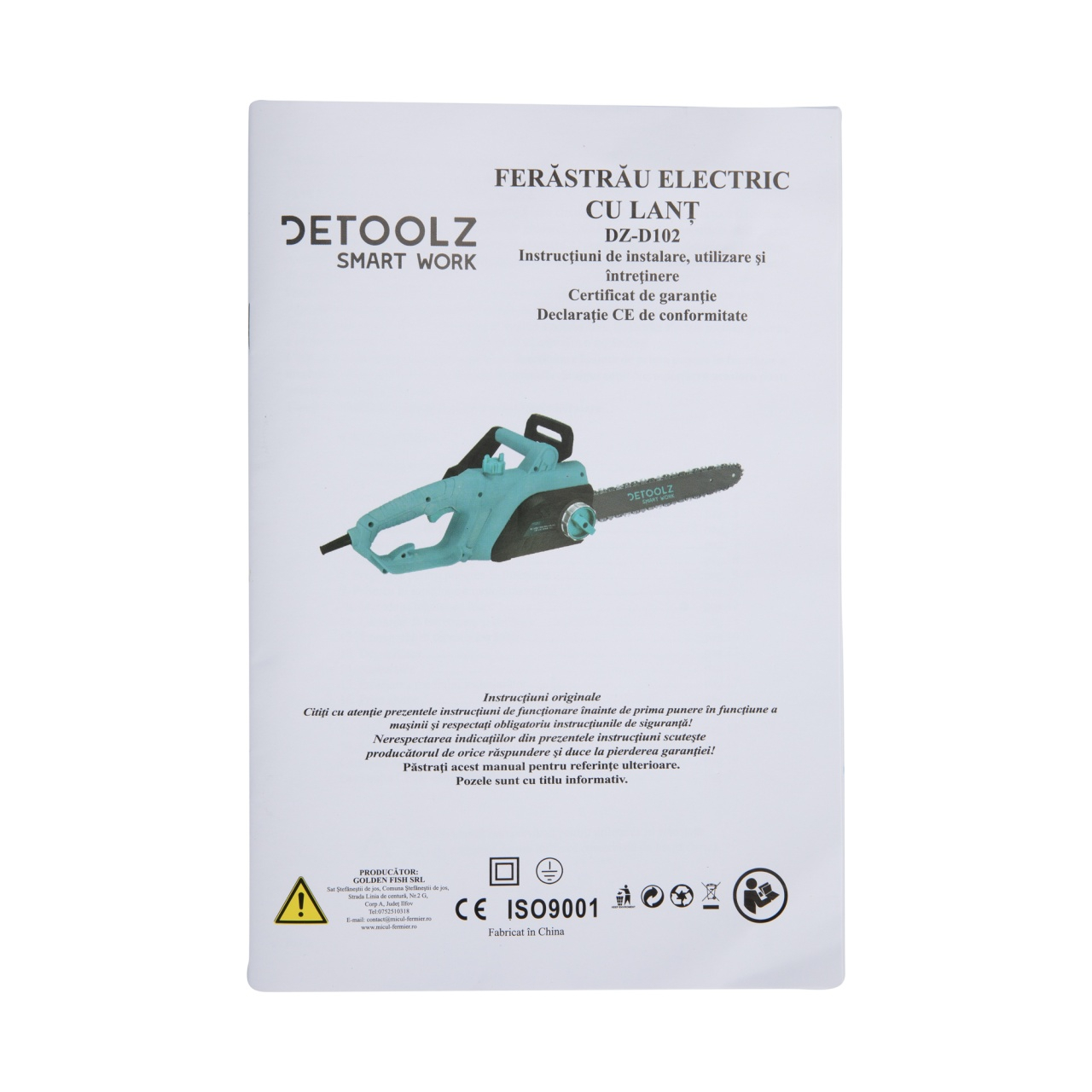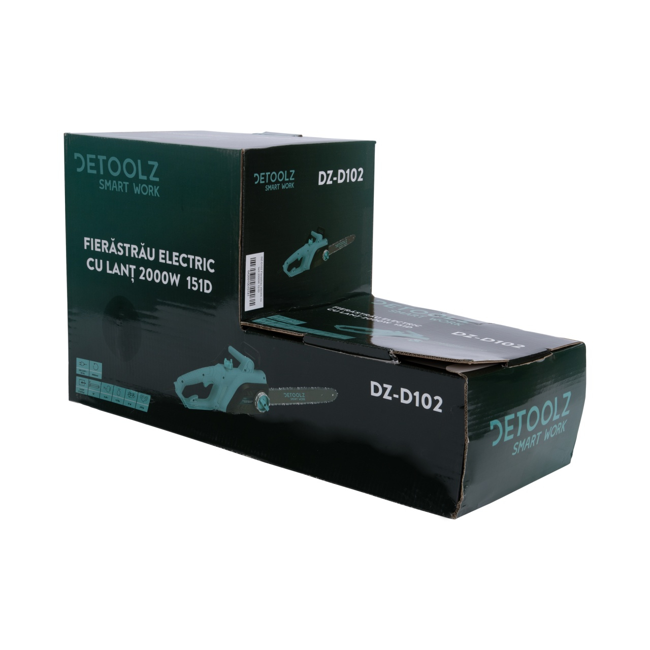 Cu un motor puternic de 2000 W, pozitionat longitudinal, si cu o lungime de taiere de 395mm fierastraul electric Detoolz DZ-D102 este un utilaj echilibrat si usor de manuit si este ideal pentru lucrari de dulgherie sau constructii din lemn.Motofierastraul Detoolz DZ-D102 are aceeasi functie ca si angrenajul unui electromotor.Lantul circulant al motofierastraului este dirijat prin intermediul unei lame (sina de ghidare). Utilajul este dotat cu un sistem de strangere rapida a lantului si o frana pentru oprirea rapida a lantului.Dispune de rezervor de ulei pentru lubrifierea continua a lantului.Caracteristici ale fierastraului electric cu lant 2000W, 151D, Detoolz DZ-D102: •Montarea lamei si tensionarea lantului se realizeaza prin sistemul clasic, cu suruburi; •Pompa de ulei cu debit variabil; •Pornire lenta prin limitarea curentului la pornire; •Ungere automata a lantului; •Sistem de franare a lantului; •Gheara metalica pentru distribuirea eficienta a fortelor; •Frana de siguranta dubla.Avantaje utilizare Fierastraul electric cu lant 2000W, 151D, Detoolz DZ-D102: •Vizorul rezervorului de ulei permite verificarea cu usurinta a nivelului de ulei; •Taiere rapida datorita cuplului mare furnizat de motor; •Manerul frontal ergonomic si bine pozitionat face taierea pe orizontala foarte facila; •Limitarea curentului la pornire protejeaza reteaua electrica.Continut pachet Fierastraul electric cu lant 2000W, 151D, Detoolz DZ-D102:•1 x Cheie combinata;•1 x Aparatoare lama;•1 x Cutie de carton;•1 x Fierastrau electric;•1 x Lama;•1 x Lant.