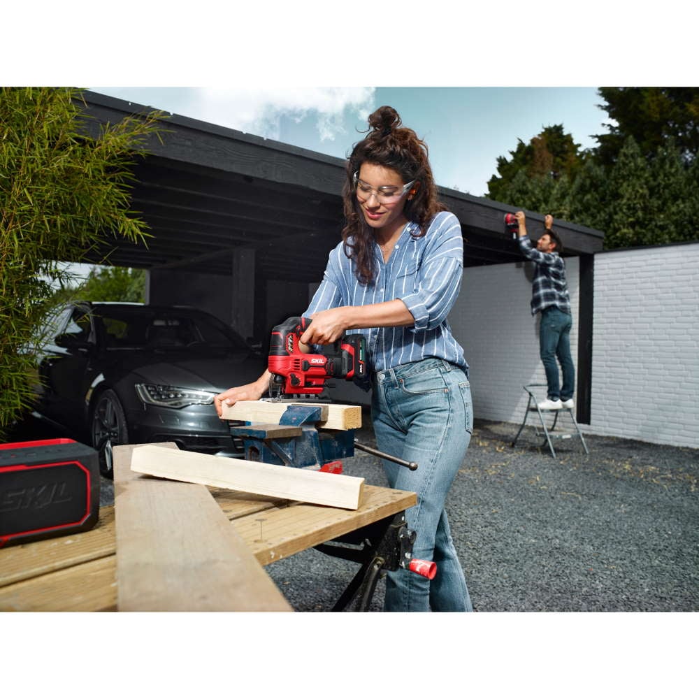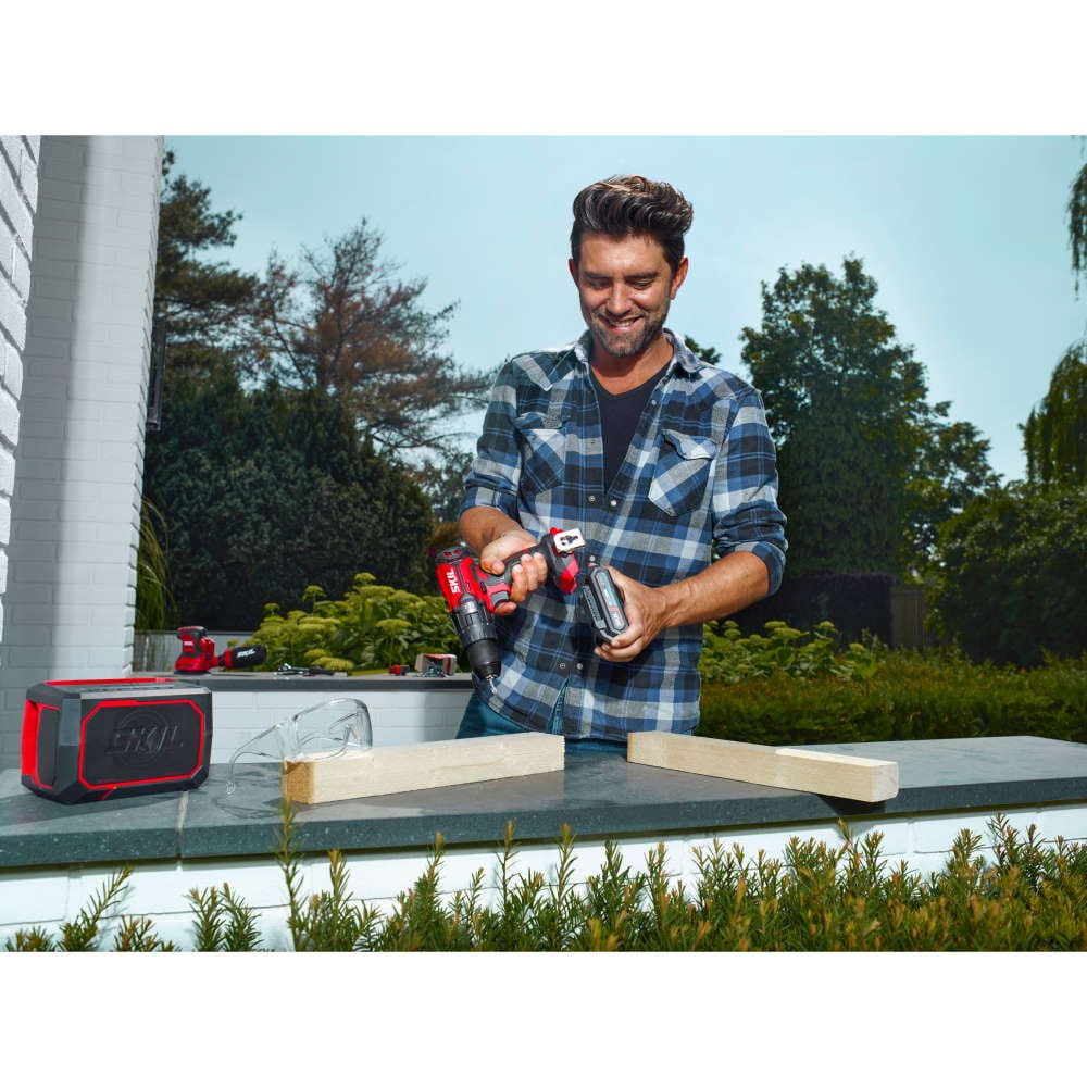 „20V Max” (18 V) SKIL 3151 este un difuzor Bluetooth cu acumulator practic. Funcţia sa de transmisie prin Bluetooth fără fir, pe o distanţă de până la 30 de metri, combinată cu libertatea oferită de acumulator, asigură sunet de calitate superioară oriunde vă deplasaţi. Pentru confortul dumneavoastră, puteţi utiliza şi cablul AUX pentru a conecta smartphone-ul sau un alt dispozitiv de intrare la difuzorul Bluetooth. Pentru a produce sunetul de calitate superioară, SKIL 3151 este dotat cu difuzoare bass duble pasive care optimizează sunetul tonalităţilor joase. Per ansamblu, acest difuzor vă permite literalmente să ascultaţi muzica preferată în atelier, garaj sau zona în care desfăşuraţi lucrările de bricolaj, fără necesitatea alimentării cu energie electrică. Puteţi muta cu uşurinţă difuzorul dintr-un loc în altul, datorită designului compact şi portabil. De asemenea, vă puteţi încărca telefonul sau tableta folosind portul de încărcare USB. Pentru a vă păstra dispozitivele la îndemână, difuzorul Bluetooth cu acumulator prezintă un locaş de depozitare integrat în partea superioară. SKIL 3151 CA este prevăzut cu un cablu AUX. Acumulatorul nu este inclus.