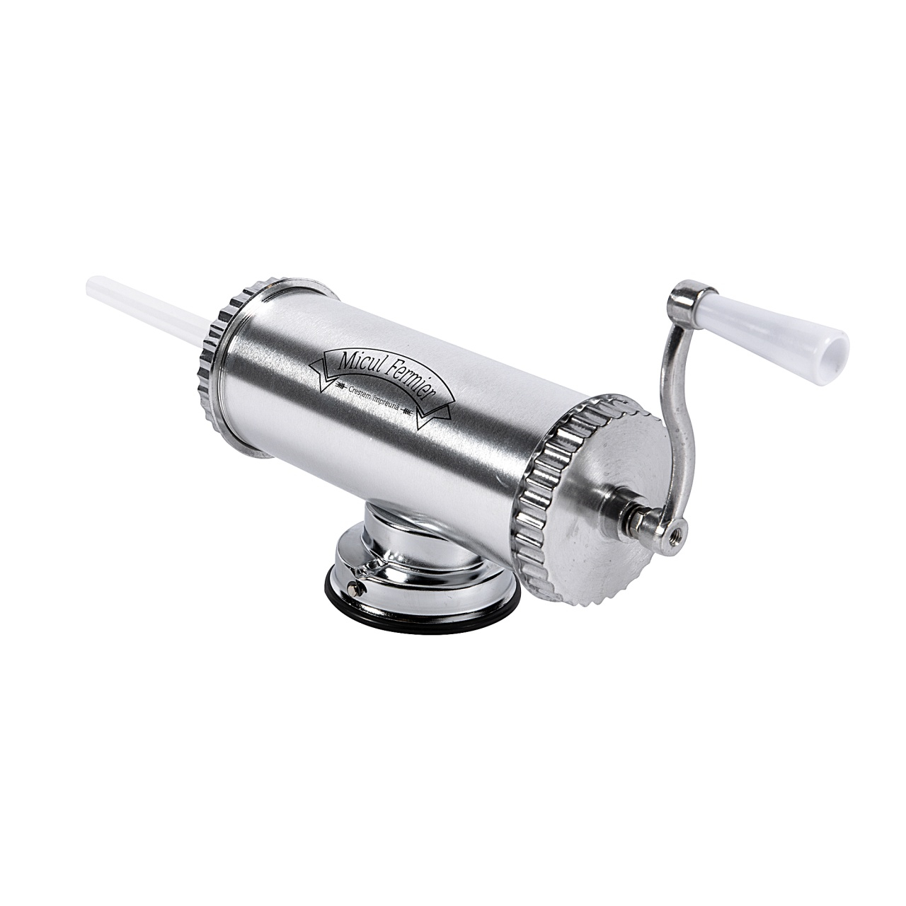 Acum traditionalii si deliciosii carnati pot fi facuti oricand la dumneavoastra in bucatarie. Puteti prepara carnati de casa cu aparatul de capacitate maxima 1.5 kg dupa propria dumneavoastra reteta. Aparatul de carnati va ofera posbilitatea sa preparati carnatii intr-un timp foarte scurt. Aparatul este practic si foarte usor de folosit. Acesta vine pe un suport cu ventuza si cu o clema de prindere. Specificatii tehnice masina de carnati cu ventuza,1,5kg, aluminiu , Micul Fermier GF-0824:• prinderea se face in doua moduri: cu ventuza sau pe masa, cu filet;• este usor de folosit si curatat;• este confectionat din aluminiu inoxidabil;• are o capacitate de maxim 1.5kg. Pachetul contine:• aparatul pentru carnati,• manivela de filet atasabila,• accesoriu de prindere pe masa,• cheita pentru insurubat,• soclu pentru palnii,• 5 palnii de diferite dimensiuni. Masina de facut carnati are specificatiile de utilizare inscriptionate pe cutie, cat si un grafic cu componentele si rolul acestora.