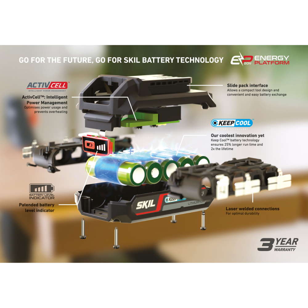 Această unealtă este o parte din SKIL „Energy Platform”: SISTEMUL flexibil pentru acumulatori. Cu acumulatorul „20V Max” (18 V) litiu-ion aveţi asigurată o flexibilitate optimă. Bateriile sunt concepute pentru a funcţiona şi sunt concepute astfel încât să se potrivească tuturor uneltelor „Energy Platform”, ceea ce înseamnă că o singură baterie le poate alimenta pe toate. Instrumentele „Energy Platform” sunt disponibile cu şi fără baterii, ceea ce vă oferă flexibilitatea de a adăuga mai multe instrumente în gama dvs. fără a fi obligat să cumpăraţi noi baterii şi încărcătoare. Acest acumulator conţine atât tehnologie „Keep Cool™”, cât şi „ActivCell™”. „Keep Cool™” răceşte celulele acumulatorului pentru a preveni supra-încălzirea acestora, ceea ce creşte durata de funcţionare cu până la 25% şi dublează durata de viaţă a acumulatorului! Tehnologia „ActivCell™” funcţionează pentru a optimiza utilizarea energiei, pentru a preveni supraîncălzirea şi pentru a maximiza performanţa acumulatorului.