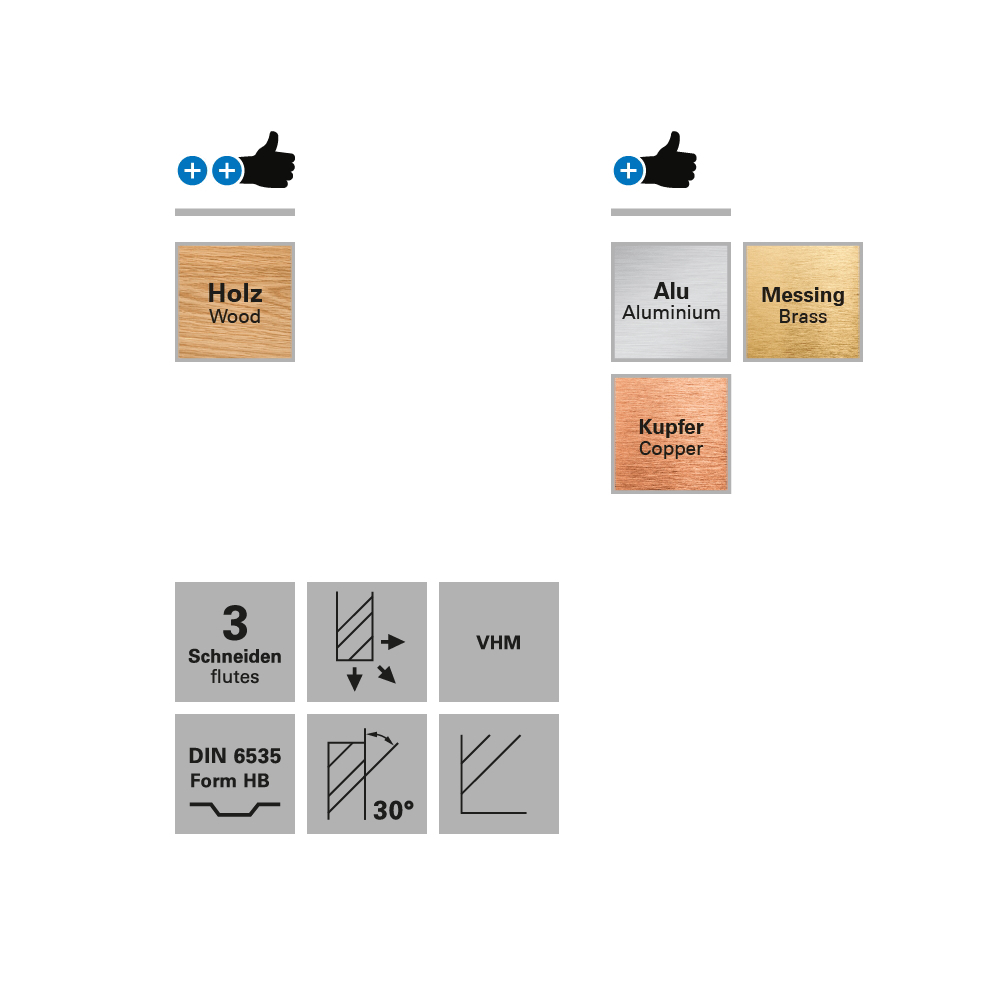 Pentru prelucrarea materialelor mai dure la turatii mai mici, aceste freze cu trei caneluri pot fi o solutie foarte buna. Ele sunt echilibrate si puternice, producand vibratii minime, de unde rezulta o calitate foarte buna a finisarii suprafetelor.