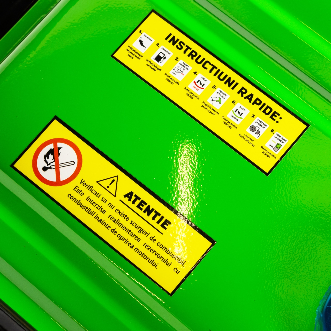 Micul Fermier, utilizeaza cea mai recenta tehnologie Automatic Voltage Regulator (AVR), care regleaza tensiunea de iesire si opreste alternatorul daca apare o supraincarcare. De asemenea, generatoarele Micul Fermier de uz general beneficiaza de un panou de control modern, cu voltmetru ,circuit de protective, indicatori optici de stare si redresor. Pot fi folosite cu succes acasa, in comunitate, in zonele de pescuit, zone rurale, pasuni, camp sau ca rezerva de energie in caz de urgenta. Avantaje generatorul de benzina 2800W, Micul Fermier MF-3500:•Design deosebit si tehnologie moderna;•Greutate redusa;•Structura compacta;•AVR-ul imbunatatit limiteaza fluctuatiile curentului de iesire si ofera protective la suprasarcina, oprind automat generatorul, evitand astfel avarierea sistemului;•Functionare fiabila si precisa;•Nivel de zgomot redus datorita carcasei dublu insonorizata si a sistemului de combustie de mare eficienta care asigura arderea completa;•Toba de esapament supradimensionata si sistemul de combustie de mare eficienta cu arderea completa, asigura un nivel redus de zgomot. Depozitare:•Cand generatorul nu este folosit sau este depozitat pentru o perioada indelungata, verificati daca incaperea este corespunzatoare din punct de vedere al umiditatii si a prafului;•Curatati generatorul;•Scoateti combustibilul;•Agitati rezervorul pana la scurgerea intregului exces;•Se toarna aproximativ o lingura de ulei de motor, prin orificiul bujiei apoi trageti starter-ul de cateva ori si instalati stecherul (cu contact oprit), pana cand simtiti o rezistenta;•Pastrati generatorul acoperit, intr-un loc bine aerisit.