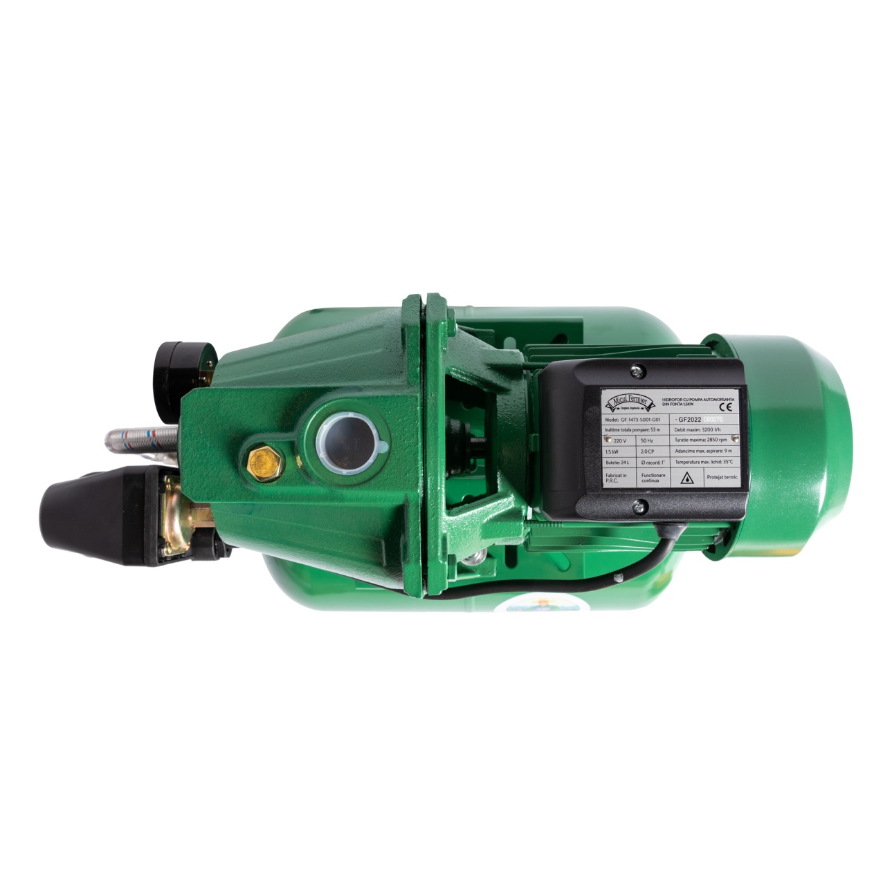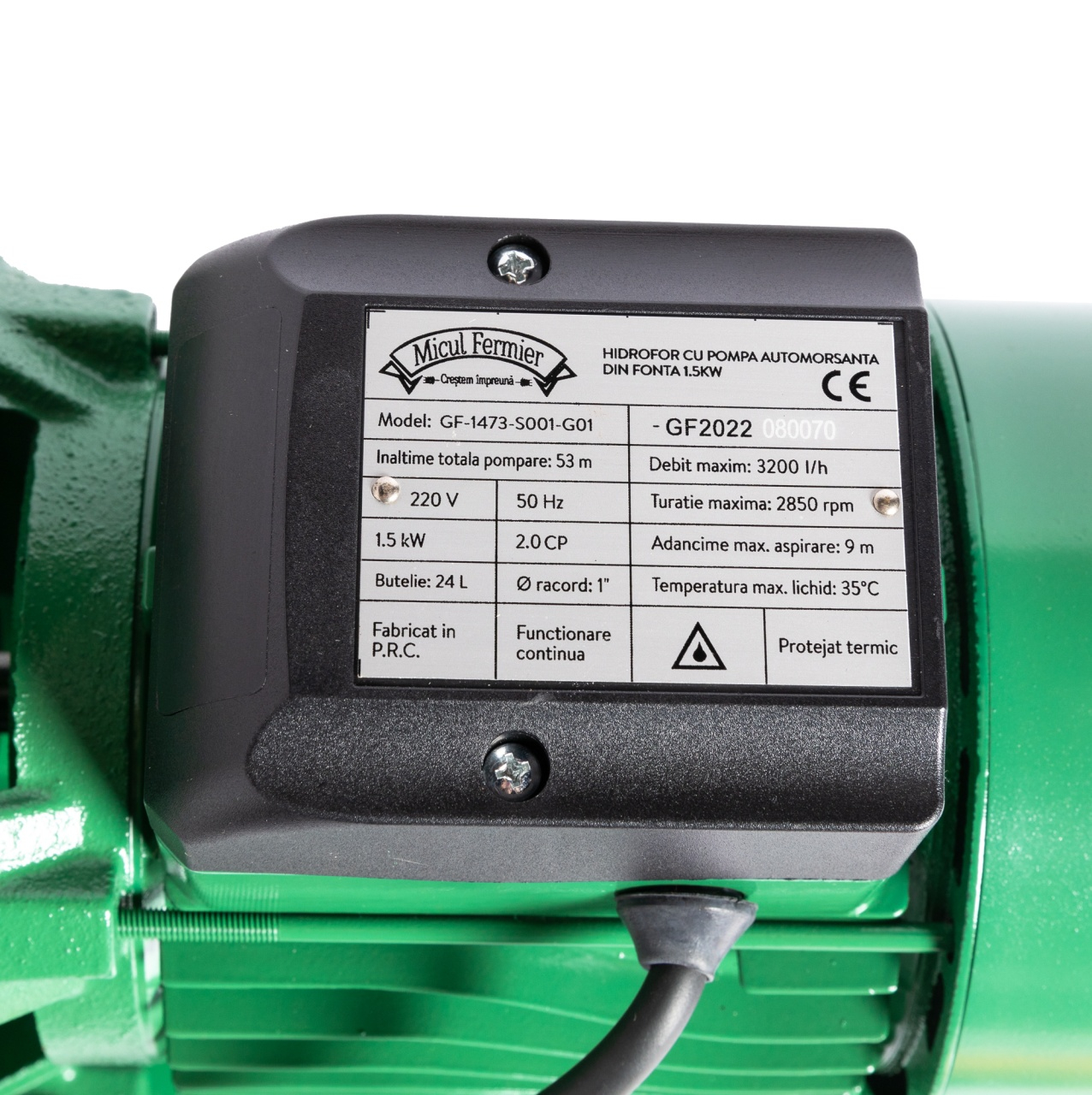 Hidrofor cu pompa autoamorsanta din fonta 1,5 kW, Micul Fermier, GF-1473-S001-G01 este construit pentru a oferi eficienta optima, costuri reduse pe termen lung si o fiabilitate de functionare mare, indiferent de aplicatie. Hidroforul se utilizeaza pentru alimen tarea cu apa a imobilelor individuale rezidentiale, udarea gradinilor, asigurarea functionarii masinilor de spalat automate, boilerelor electrice, centralelor pe gaze cu doua circuite, puturilor, bazinelor naturale cu apa etc.Cu acest hidrofor veti putea transfera apa curata sau alte lichide necorozive cu vascozitate redusa. Nu transferati lichide inflamabile, explozive, gazificate si lichide care contin particule sau fibre solideHidrofor cu pompa autoamorsanta din fonta 1,5 kW, Micul Fermier, GF-1473-S001-G01 are urmatoarele caracteristici: Construit din materiale de fabricatie de cea mai buna calitate, usoare si rezistente pentru o durata de viata extinsa. Design deosebit si tehnologie moderna. Greutate redusa. Structura compacta. Functionare fiabila si precisa.