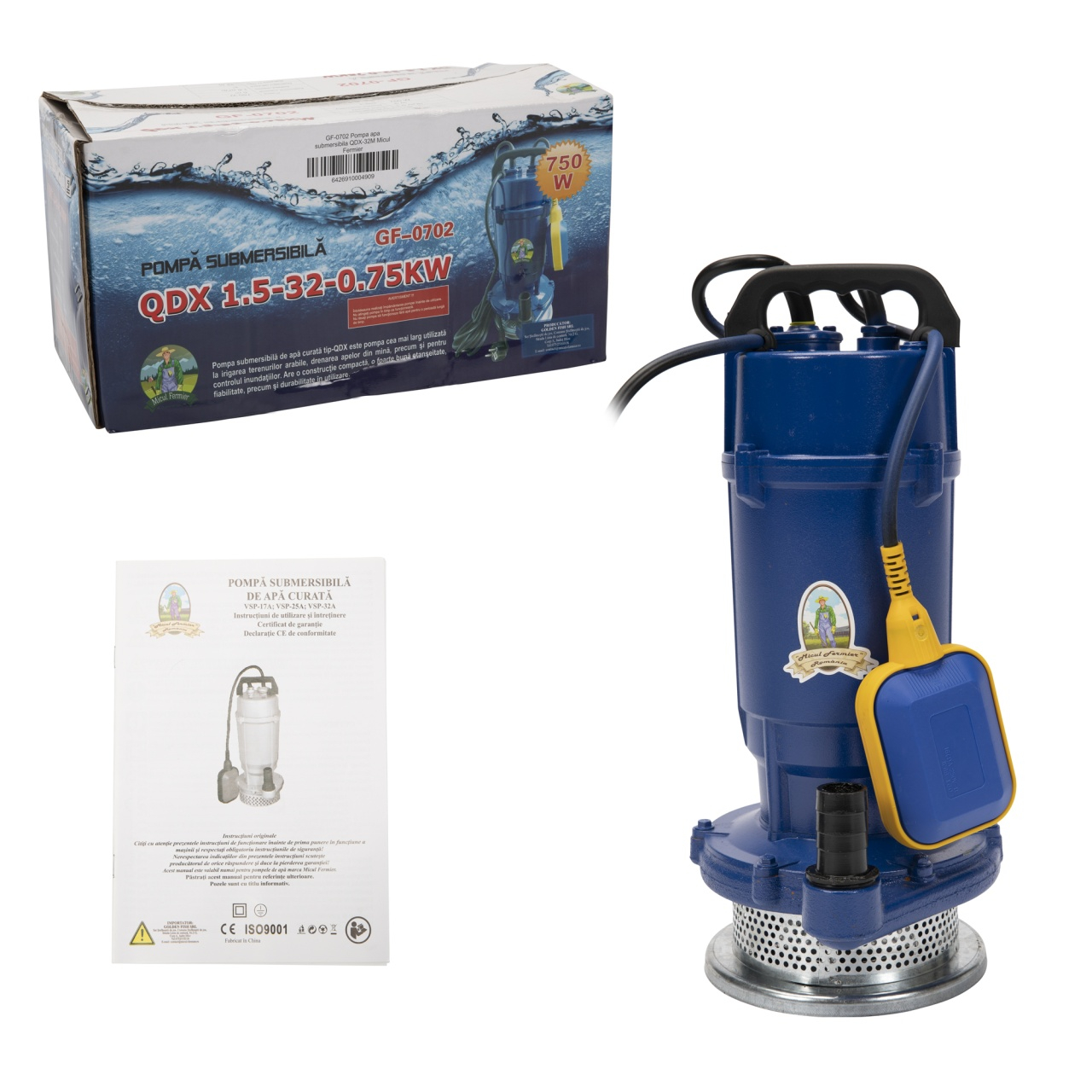 Pompa submersibila de calitate superioara Micul Fermier QDX 32m, 750W, GF-0702 este perfecta pentru extragerea apelor din piscine, fantani, irigatii gradini, evacuarea apei din subsoluri inundate, chiuvete, rezervoare, bai, chiar si pentru operarea cascadelor. Rata de pompare asigura un debit ridicat si stabil, la inaltimi medii (32m). Pompele Micul Fermier sunt realizate in intregime din materiale non-corozive si rezistente la uzura. Aceste pompe submersibile sunt utilizate in mod normal pentru alimentarea cu apa curata fara particule abrazive, irigare, precum si diverse aplicatii industriale. Plutitorul taie automat pompa oprit atunci cand apa a scazut la nivelul cerut. Utilizare Pompa apa submersibila 32m, 0,75kW, Micul Fermier GF-0702•Pompa submersibila este cea mai larg utilizata pentru alimentarea cu apa, sala de mese si cladiri inalte; pentru irigarea terenurilor agricole; pentru alimentarea cu apa si canalizare•Pompa submersibila este destinata pomparii apei la o temperatura maxima de 35 °C. Acest aparat nu va fi folosit pentru alte fluide, in nici un caz pentru combustibili pentru motoare, detergenti sau alte produse chimice! Montarea acestui aparat intr-un put confera siguranta contra inundatiilor. Acesta isi gaseste insa utilitatea si acolo unde apa este repompata, de ex. in gospodarii, gradinarit si in multe alte domenii. Aparatul nu se va folosi niciodata pentru exploatarea piscinelor de inot! ATENTIE! Nu recomandam utilizarea acestei pompe submersibile la scoaterea apelor murdare, cu nisip, namol, pietris.