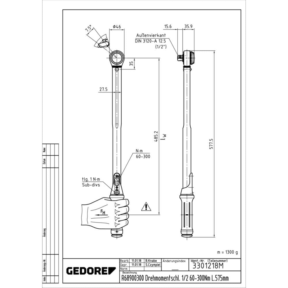 Cheie dinamometrica Gedore Red R68900300, lungime 578mm, cu patrat de antrenare de 1/2' si plaja de actiune 60 - 300 Nm