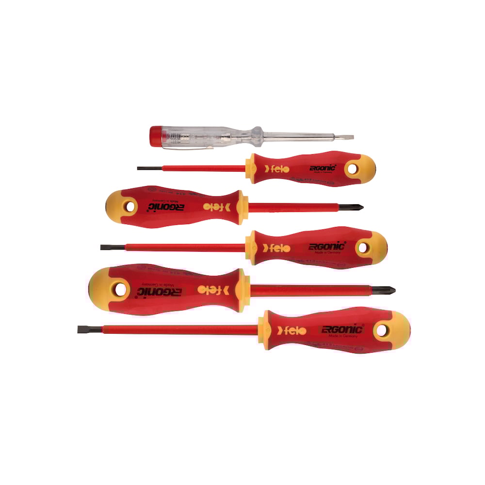Felo 41396398 este un set profesional de șurubelnițe izolate, conceput pentru lucrări electrice sigure până la 1000V AC. Acest set include 5 șurubelnițe cu vârfuri SL și PH, plus un tester de tensiune 220–250V, toate având mânere Ergonic cu design antialunecare și vârfuri Black Tip pentru precizie maximă.