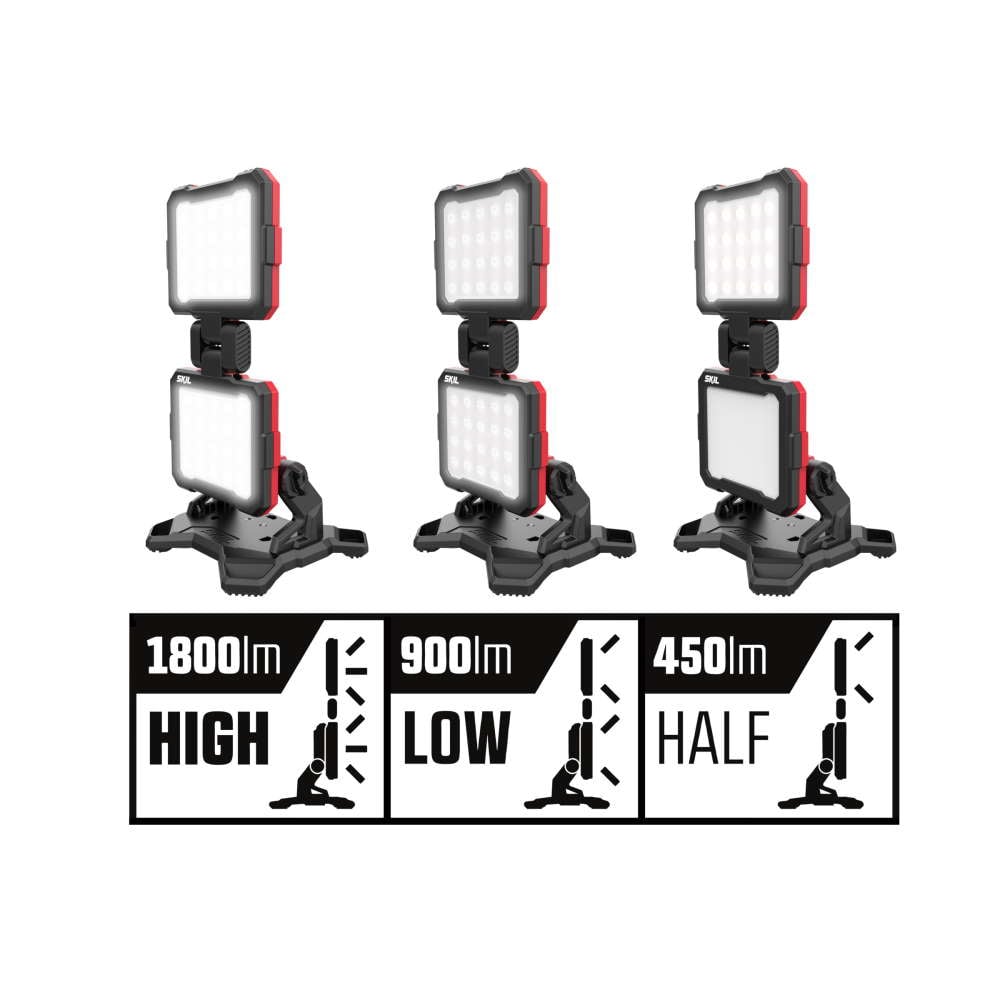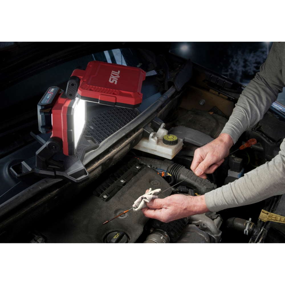 SKIL 3157 „20V Max” (18 V) este un proiector dublu cu LED pentru lucru puternic, cu acumulator, care asigură lumină oriunde aveţi nevoie în timpul lucrărilor de bricolaj. Este dotată cu funcţie de control al luminozităţii în trei trepte pentru lumină suplimentară oricând aveţi nevoie, comutarea între aceste setări diferite ale luminii fiind uşor de realizat. Această sculă asigură lumină albă puternică de până la 1800 de lumeni, care este echivalentul în luminozitate al unui bec incandescent de 100 W. Spre deosebire de un bec cu incandescenţă, SKIL 3157 contribuie la economisirea energiei şi este mai ecologic. Pentru confort suplimentar în timpul lucrului, puteţi regla cu uşurinţă ambele capete ale lămpii în poziţii diferite pentru a orienta lumina în direcţia dorită. O altă opţiune este agăţarea proiectorului dublu cu LED pentru lucru folosind cârligul metalic integrat. Aceste caracteristici utile asigură disponibilitatea ambelor mâini atunci când vă desfăşuraţi lucrările de bricolaj. Lumina se stinge automat atunci când cele două capete ale lămpii sunt pliate.