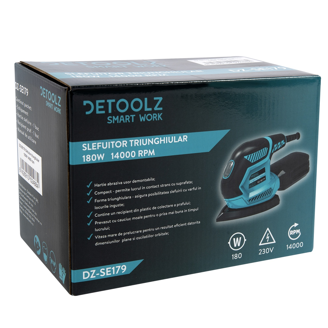 Slefuitorul triunghiular 180W, 14000rpm, Detoolz DZ-SE179 este destinat slefuirii uscate a lemnului, plasticului, metalului, materialului de umplutura, precum si a suprafetelor acoperite, cu viteza mare de prelucrare pentru un rezultat eficient datorita dimensiunilor plane si oscilatiilor orbitale. Forma triunghiulara asigura posibilitatea slefuirii cu varful in locurile inguste. Contine un recipient din plastic de colectare a prafului pentru a reduce praful rezultat. Avantaje slefuitorul triunghiular 180W, 14000rpm, Detoolz DZ-SE179•hartie abraziva demontabila usor;•forma triunghiulara asigura posibilitatea slefuirii cu varful in locurile inguste;•contine un recipient din plastic de colectare a prafului pentru a reduce praful rezultat.•prevazut cu cauciuc moale pentru o priza mai buna in timpul lucrului. Continut pachet slefuitorul triunghiular 180W, 14000rpm, Detoolz DZ-SE179•echipament; •hatie slefuire - 1 buc.•cutie praf - 1 buc.•manual utilizare.