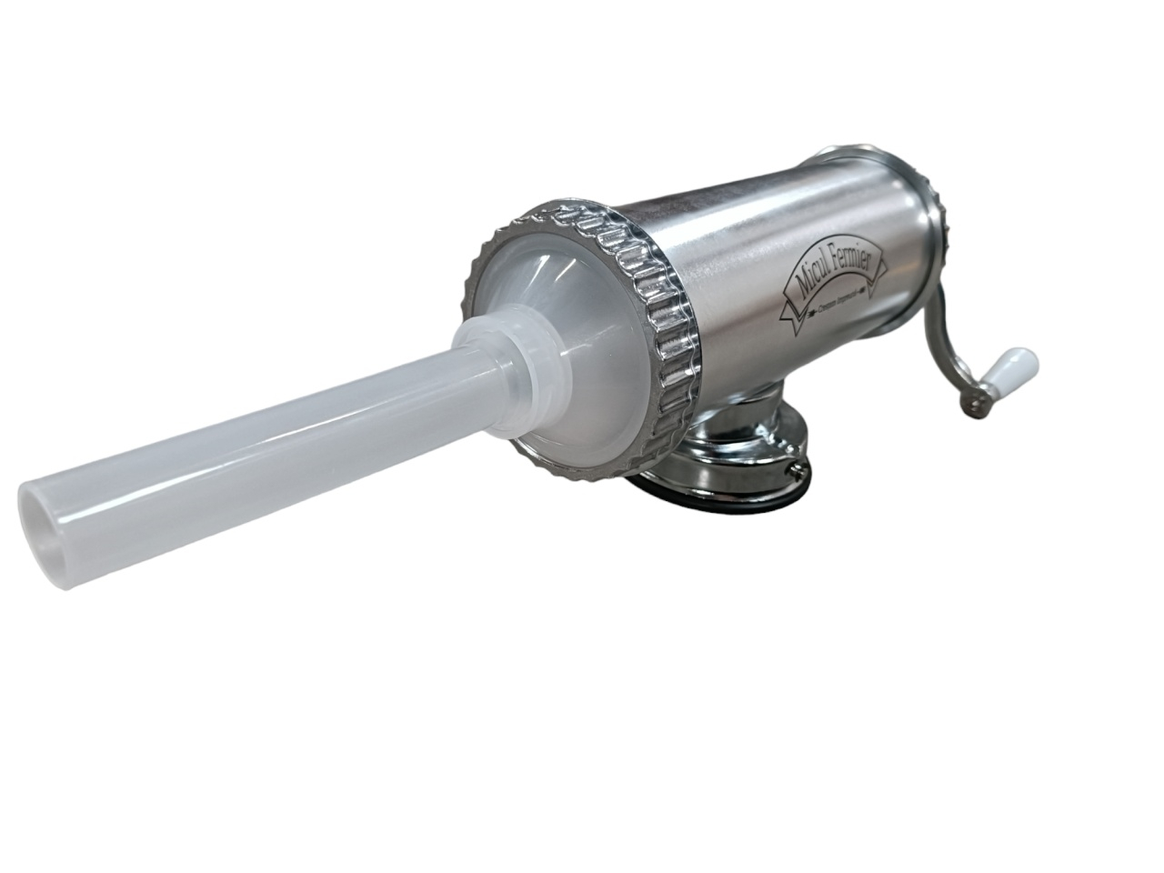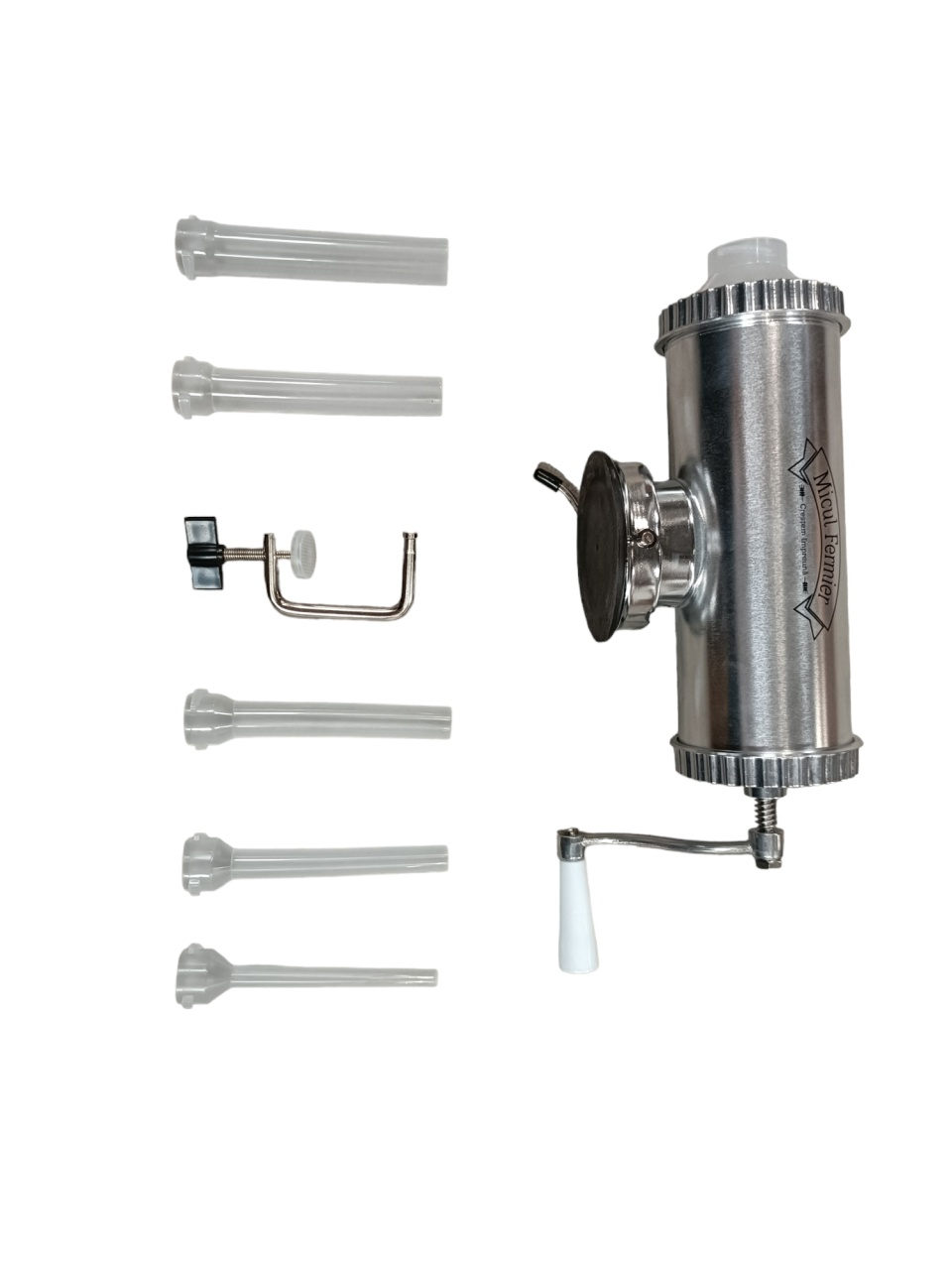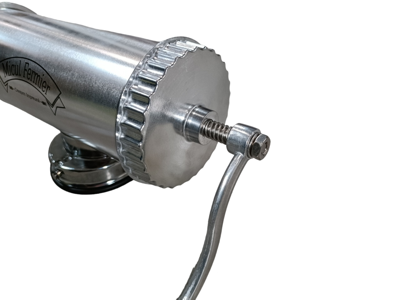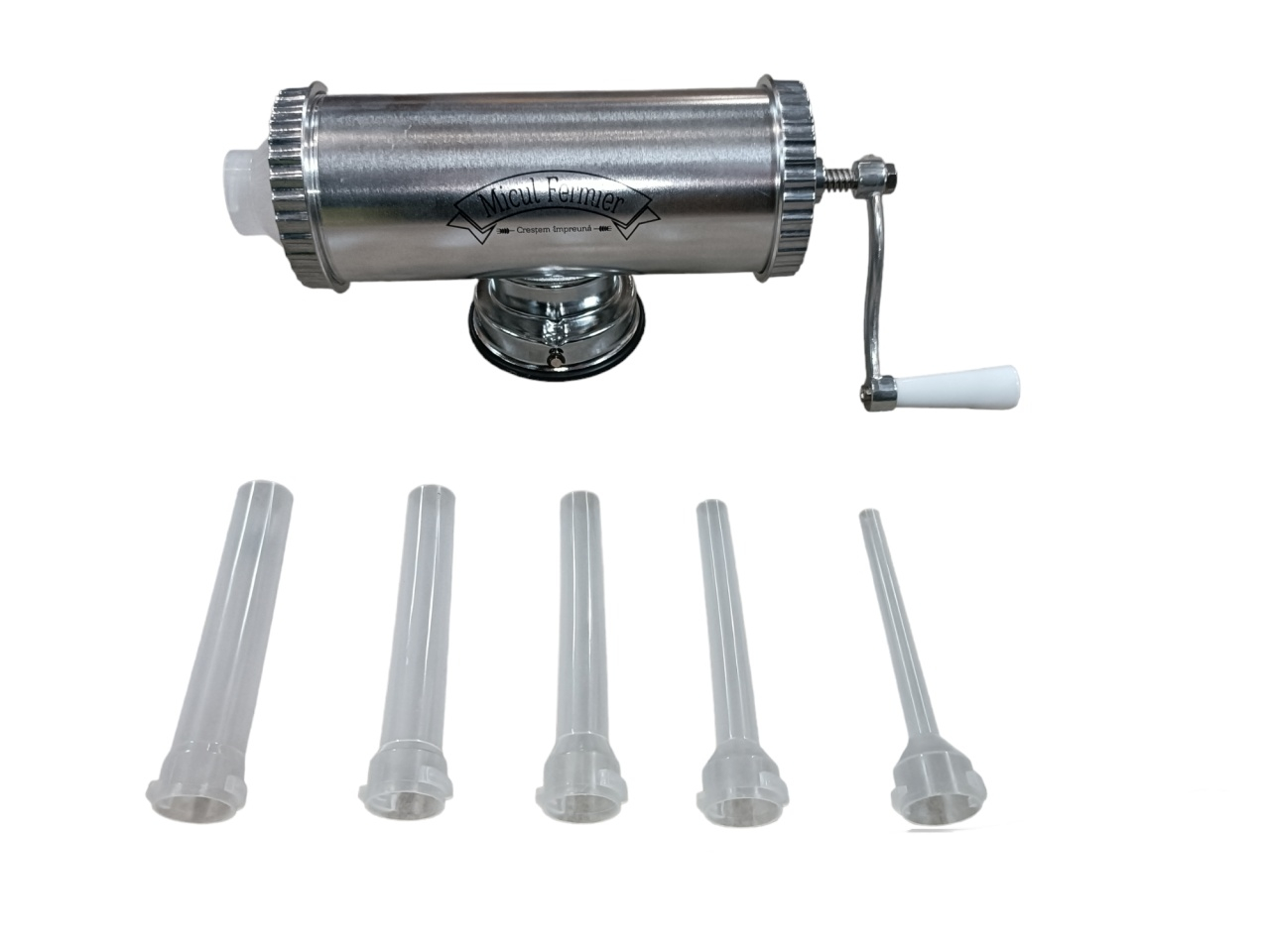 Masina de carnati 1.5kg AL ventuza 5 palnii, Micul Fermier GF-0824-S001-G02Acum traditionalii si deliciosii carnati pot fi facuti oricand la dumneavoastra in bucatarie. Puteti prepara carnati de casa cu aparatul de capacitate maxima 1.5 kg dupa propria dumneavoastra reteta. Aparatul de carnati va ofera posbilitatea sa preparati carnatii intr-un timp foarte scurt. Aparatul este practic si foarte usor de folosit. Acesta vine pe un suport cu ventuza si cu o clema de prindere.Specificatii tehnice masina de carnati cu ventuza., 1.5kg, aluminiu , Micul Fermier GF-0824-S001-G02:• prinderea se face in doua moduri: cu ventuza sau pe masa, cu filet;• este usor de folosit si curatat;• este confectionat din aluminiu inoxidabil;• are o capacitate de maxim 1.5kg.Pachetul contine:• aparatul pentru carnati,• manivela de filet atasabila,• accesoriu de prindere pe masa,• cheita pentru insurubat,• soclu pentru palnii,• 5 palnii de diferite dimensiuni.Masina de facut carnati are specificatiile de utilizare inscriptionate pe cutie, cat si un grafic cu componentele si rolul acestora.