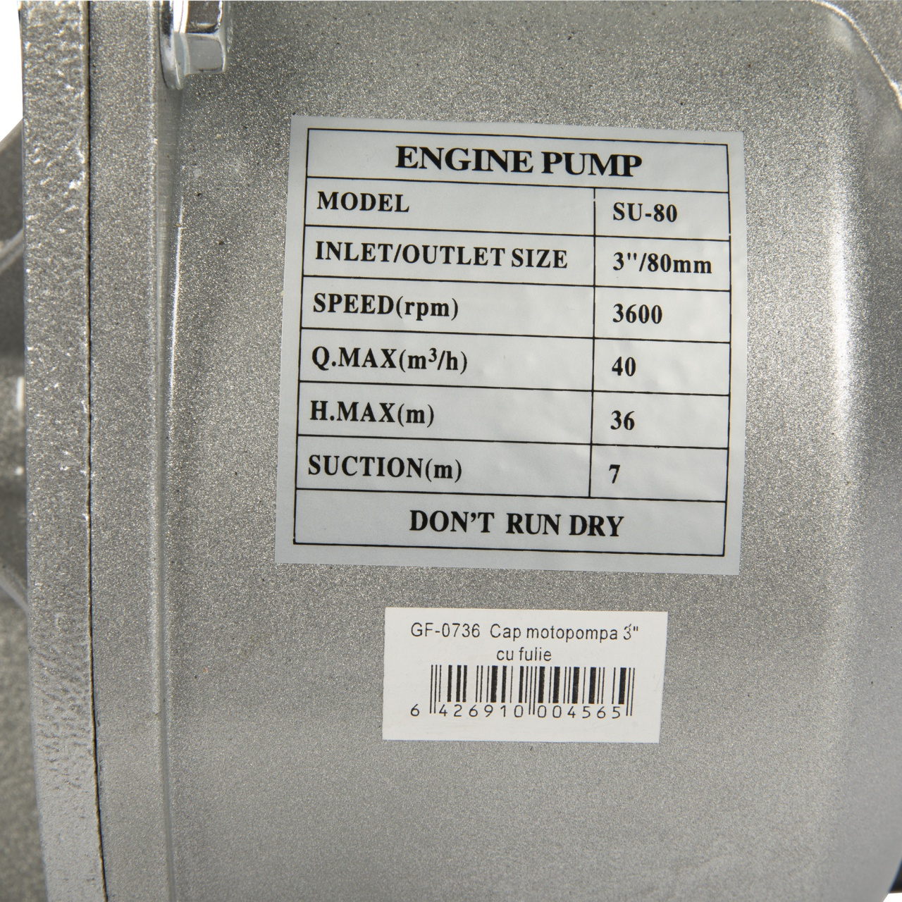 Capul pentru motopompa Micul Fermier GF-0736 cu fulie, diametru 3 toli este un produs robust, eficient si fiabil ce necesita o intretinere minimala, este un produs universal pentru toate tipurile de motopompe. Capul pentru motopompa Micul Fermier GF-0736 cu fulie, diametru 3 toli poate fi utilizat ca piesa de schimb pentru motopompa de 3'' dar se pot folosi si ca atare pentru transferul apei prin utilizarea unui motor si a unei curele de transmisie care sa invarta turbina din interior si astfel sa poata transfera apa. Capul alaturi de motopompa poate fi utilizat pentru o gama larga de aplicatii casnice sau gospodaresti cum ar fi: • pomparea apei curate ce nu este destinata consumului uman avand impuritati 0,1% sub 0,2mm, la temperaturi 0°C÷40°C si aciditate de PH 4÷10; • la alimentarea cu apa din fantani, lacuri, rauri; • transportul apei curate prin conducte pe distante lungi, umplerea rapida a rezervoarelor, la irigarea culturilor in gradini, livezi; • spalarea vitelor, grajdurilor, uneltelor si utilajelor agricole; pentru aspirare din canale sau pentru instalatii sub presiune cu aspersoare, etc. Daca temperatura aerului de admisie a motorului depaseste 40°C sau altitudinea este peste 1000m, densitatea aerului devine mai scazuta si va produce o pierdere a puterii motopompei. Capul pentru motopompa Micul Fermier GF-0736 are urmatoarele caracteristici: • Se poate atasa oricarui tip de motor; • Se poate atasa motorului cu ajutorul unei curele. Curea are rolul de a cupla fulia pompei de apa la fulia motorului; • Este compact si usor, cu un consum redus de carburant si fara a necesita o intretinere costisitoare; • Se poate atasa cu usurinta motorului cu ajutorul unei fulii; • Cu cat turatia creste, cu atat debitul si presiunea cresc; • Constructie robusta, din materiale de fabricatie de cea mai buna calitate, usoare si rezistente pentru o durata de viata extinsa. Continut colet: • Cap motopompa GF-0736; • Accesorii; • Manual de instructiuni.