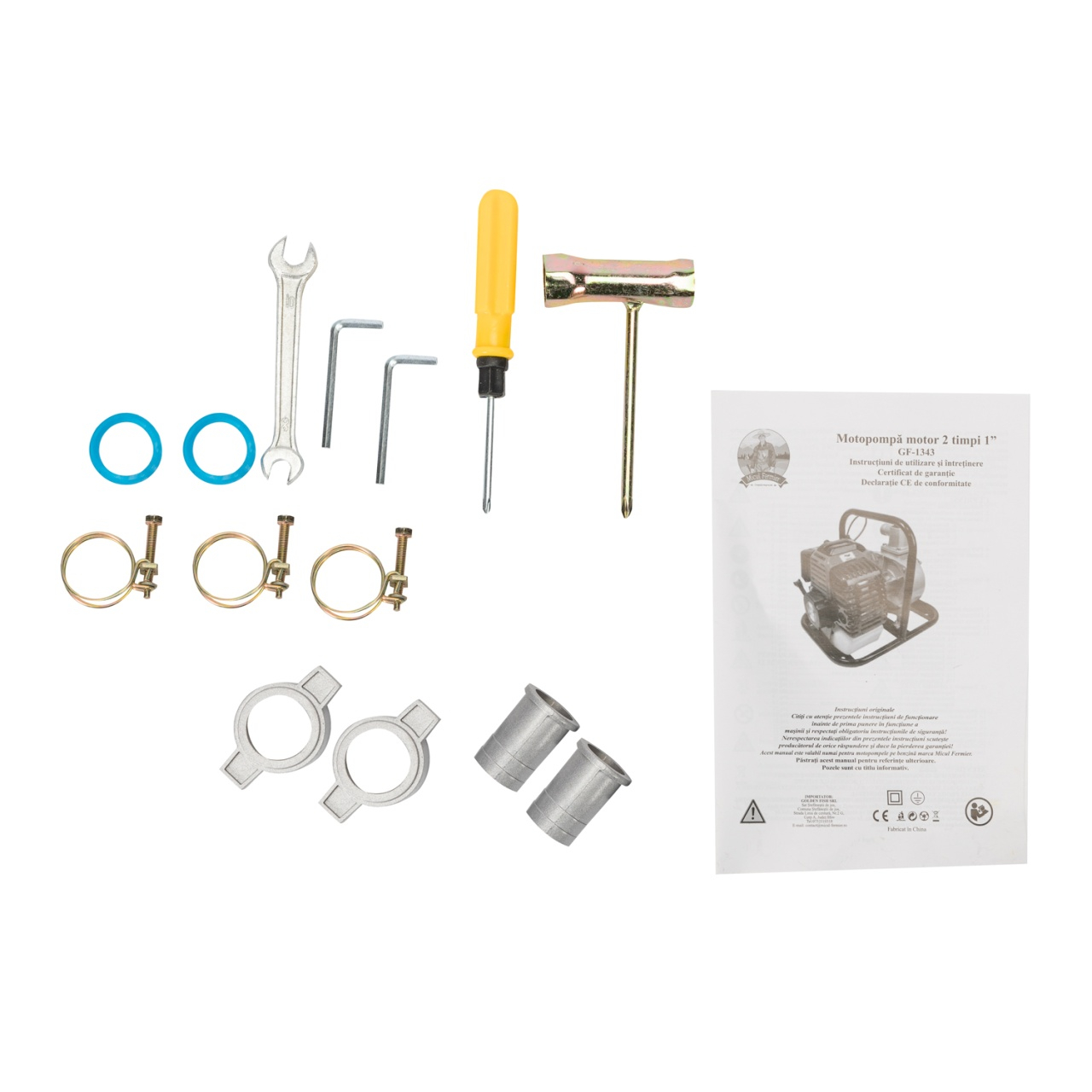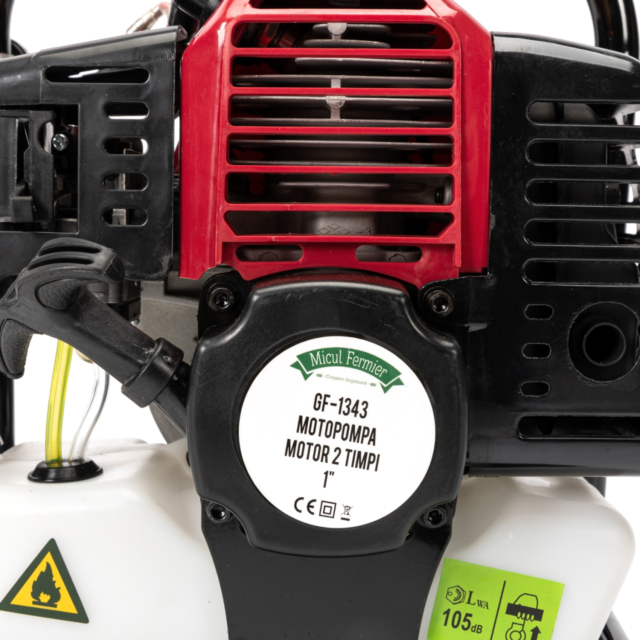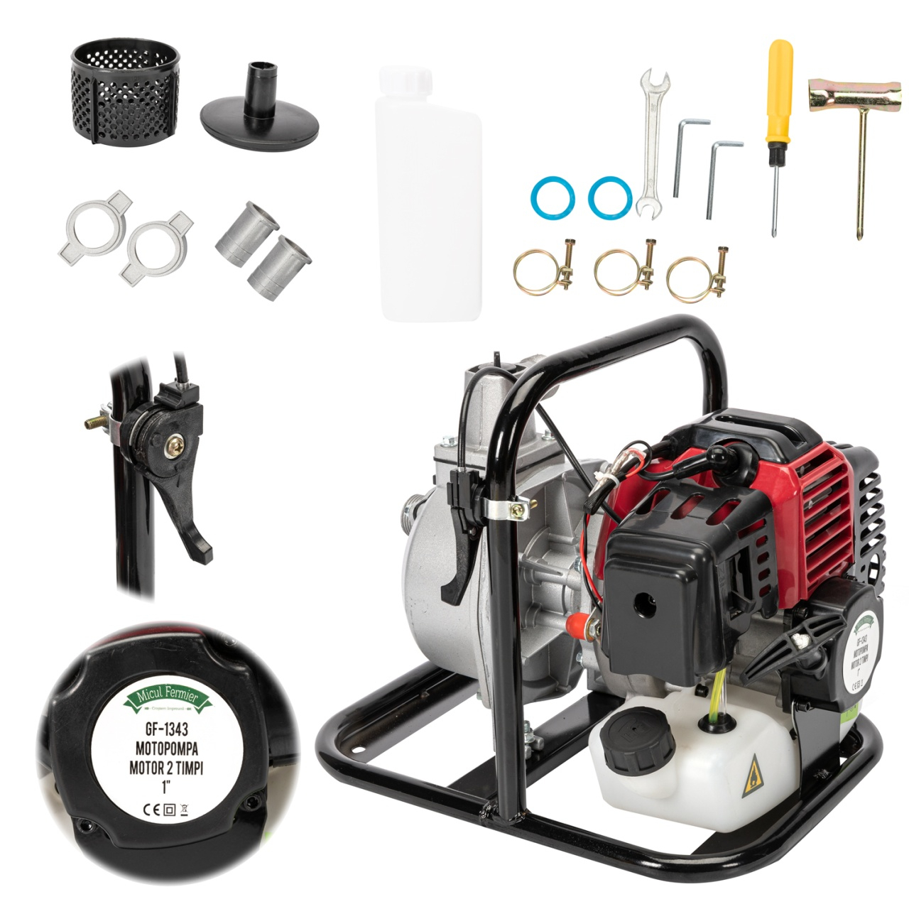 Caracteristici Motopompa pe benzina 2 timpi 1" Micul Fermier:•Amplasarea pompei pe o suprafata corespunzatoare (suprafata solida si uniforma) aproape de nivelul apei;•Se monteza furtunele de aspiratie si refulare - care sa fie mai lungi decat este necesar;•Se alimenteaza cu combustibil si ulei;•Inainte de pornirea motopompei se amorseaza pompa;•Se monteaza sorbul la capatul furtunului de aspiratie inainte de inceperea pomparii;•Se porneste motopompa manual - la sfoara.Domeniu de utilizare Motopompa pe benzina 2 timpi 1" Micul Fermier GF-1343:•pentru ape curate;•in alimentarea cu apa din fantani, lacuri, rauri si transportul apei curate prin conducte pe distante lungi, umplerea rapida a rezervoarelor, irigarea culturilor pe ogoare, gradini, livezi, vii, prin canale sau instalatii sub presiune cu aspersoare. Alimentarea cu apa curata sau desecarea bazinelor, piscinelor sau in crescatorii de peste, spalarea vitelor, grajdurilor, uneltelor si utilajelor agricole.Pachetul contine:•motopompa;•coliere;•racord;•sorb cu sita;•inbus + amortizor vibratii;•manual de utilizare.Se livreaza amabalata individual si in numar de 1 buc pentru box-carton; greutatea este de 8.30 kg per buc.