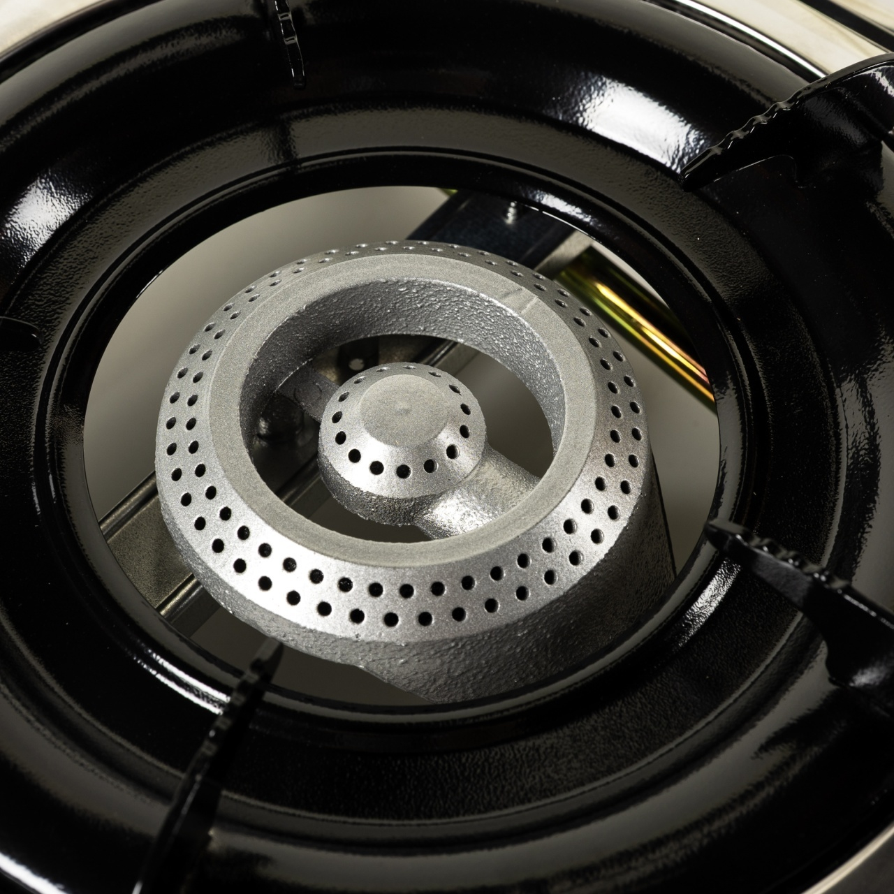 Mini aragaz portabil Detoolz, cu un ochi și putere de 2.8 kW, ideal pentru camping, drumeții sau gătit în aer liber. Dotat cu aprindere Piezo pentru utilizare rapidă și sigură. Compact și ușor de transportat.