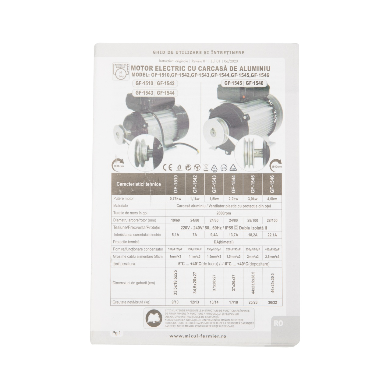 Motor electric 2800RPM, 2.2KW, cu carcasa de aluminiu, Micul Fermier GF-1544 nu este folosit niciodata singur. Un motor electric trebuie integrat intr-un sistem care necesita energie mecanica. Directia de rotatie standard pentru motoare electrice monofazice este in contra-sensul acelor de ceasornic. Domeniu de utilizare al acestor motoarelor monofazate este antrenarea diferitelor aparate electrice pentru uz gospodaresc sau similare (EN 60335-1) cum ar fi: masini pentru prelucrarea lemnului, manipulare materiale, pompe pentru lichide, sisteme de ventilatie, compresoare, suflante, pompe de vid, etc. Inainte de a porni motorul, efectuati o verificare privind: • tensiunea de alimentare a motorului corespunde tensiunii/frecventei inscrise pe eticheta; • pozitia de montare a motorului permite o buna aerisire, acces facil la conexiunea electrica si la elementele de comanda; • conexiunile din cutia de conectare au fost bine stranse si capacul este etans montat cu garnitura nedeteriorata; • verificati rotirea motorului manual; verificati prezenta sigurantei; Motor electric 2800RPM, 2.2KW, cu carcasa de aluminiu, Micul Fermier GF-1544 este compus din: •Fulie simpla/dubla; •Arbore iesire; •Scut anterior; •Caseta conexiuni; •Carcasa aluminiu; •Protectie ventilator; •Talpa fixare; •Cablu alimentare.