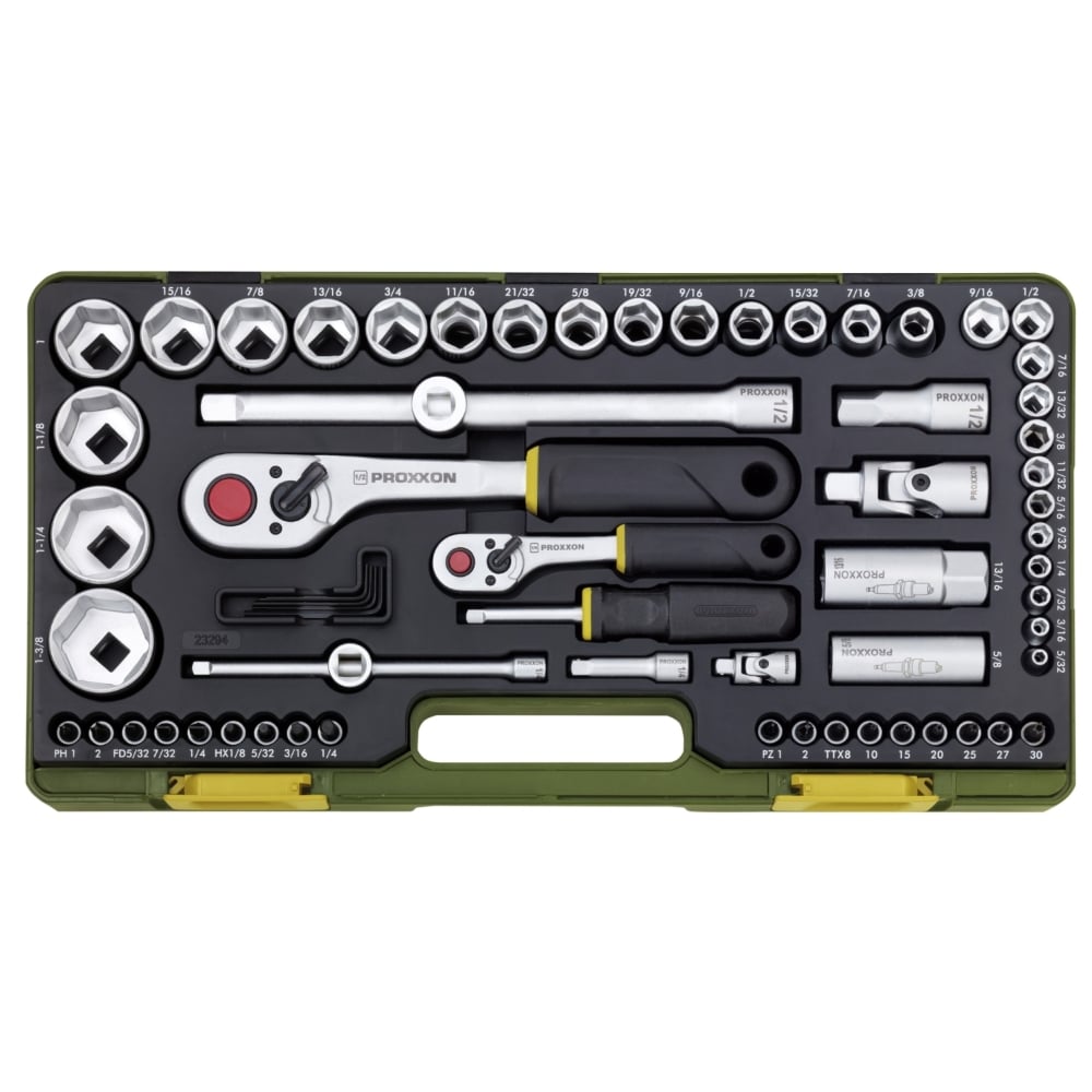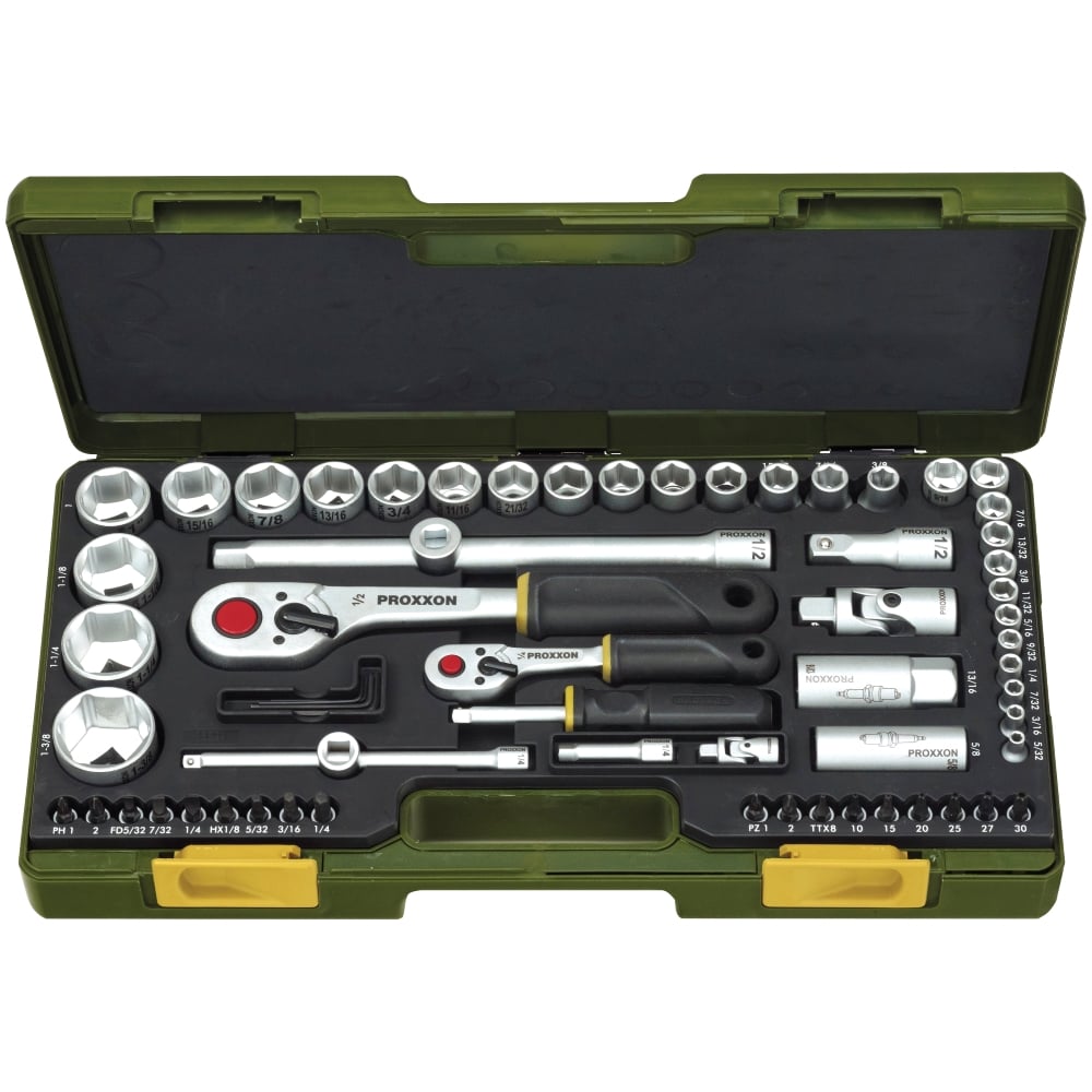 Trusa completa, versiune in Inch, cu chei tubulare de 1/4' si 1/2', Proxxon 23294, 65 piese