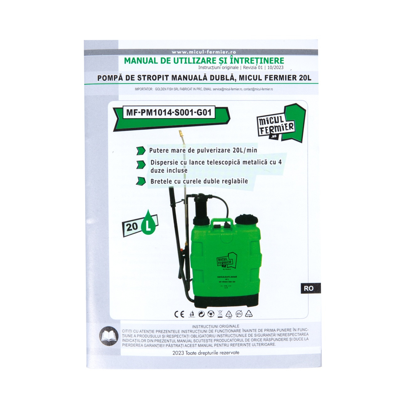 Pompa de stropit manuala, MF Pandora 20L MF-PM1014-S001-G01 este potrivita pentru pulverizarea de solutii apoase care contin: pesticide (erbicide, fungicide, insecticide, acaricide) pentru combaterea buruienilor, bolilor si daunatorilor; ingrasaminte lichide (biostimulatoare, fertilizante, aport de calciu, fier, zinc, potasiu) pentru ingrijirea plantelor, florilor, arbustilor; detergenti pentru curatarea usoara a unor suprafete sau geamurilor; apa de ploaie pentru udari; substante pentru dezinsectie si dezinfectie.Necesara in gospodarii, gradini de legume, livezi de pomi fructiferi, vii, suprafete agricole, grajdurile de pasari sau animale.Nu este permisa utilizarea pompei pentru pulverizarea de: substante chimice agresive din clase industriale; substante explozive; solventi, substante caustice cu autoincalzire; substante corozive; agenti de pulverizare care nu sunt aprobati la comercializare;