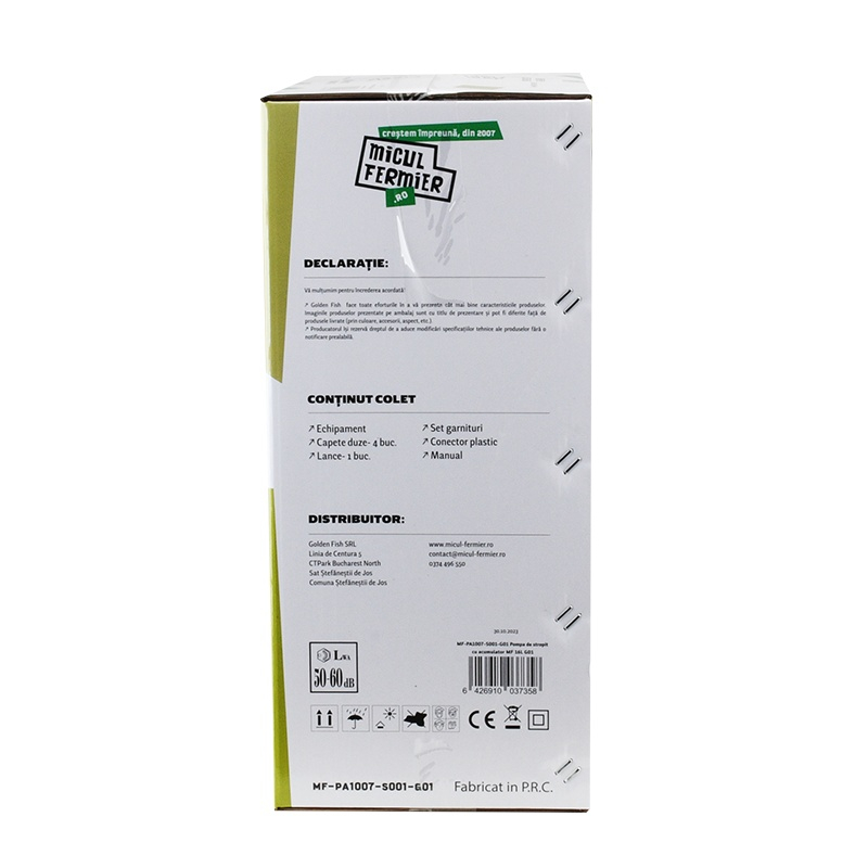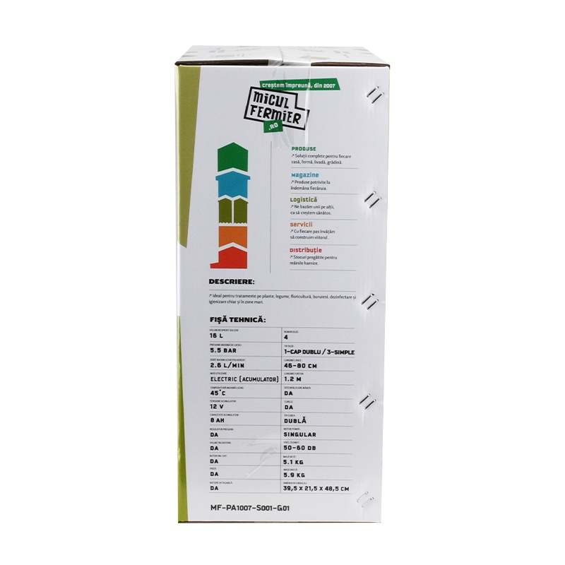 Pompă de stropit cu acumulator 16L – MF Pandora MF-PA1007-S001-G01 🌿🔋Pulverizare eficientă și confort maxim pentru grădina ta! Pompa de stropit MF Pandora MF-PA1007-S001-G01 este un echipament fiabil și ușor de utilizat, ideal pentru combaterea dăunătorilor, aplicarea îngrășămintelor lichide și dezinfectarea suprafețelor. Cu o capacitate de 16L și un acumulator puternic de 12V/8Ah, această pompă oferă pulverizare uniformă și autonomie extinsă pentru lucrări de lungă durată. 🔧 Caracteristici principale ✅ Capacitate rezervor: 16L – Ideală pentru gospodării, livezi, viță-de-vie și suprafețe agricole✅ Pulverizare uniformă și constantă – Efect nebulizator ridicat pentru acoperire eficientă✅ Acționare electrică – Funcționare fără efort datorită acumulatorului 12V/8Ah✅ Autonomie de până la 2,5 ore – Lucrezi fără întreruperi pentru rezultate rapide✅ Debit pulverizare: 2,6 L/min – Optimizat pentru consum eficient de soluție✅ Presiune maximă de lucru: 5,5 bar – Distribuire precisă și controlată a lichidelor✅ Lance telescopică din oțel inoxidabil (48-80 cm) – Reglabilă pentru acces ușor la orice suprafață✅ Duze interschimbabile – Se adaptează perfect pentru diverse tipuri de tratamente✅ Material rezervor: PP & ABS – Rezistent la uzură și substanțe chimice✅ Greutate redusă: 4,8 kg – Manevrabilitate ușoară și transport fără efort✅ Curea de umăr ergonomică tip rucsac – Benzi reglabile pentru distribuția uniformă a greutății✅ Indicator LED pentru starea bateriei: Verde – Putere normală Galben – Putere redusă Roșu – Suprasarcină✅ Regulator de presiune integrat – Control precis asupra debitului de pulverizare✅ Indicator LED pentru încărcare: 🔴 LED roșu – Indică încărcarea în desfășurare 🟢 LED verde – Indică baterie complet încărcată ✅ Timp de încărcare: 8-10 ore 📌 Utilizări recomandate ✔ Aplicare de pesticide și erbicide – Protejează culturile de boli și dăunători✔ Fertilizare cu îngrășăminte lichide – Asigură creșterea sănătoasă a plantelor✔ Pulverizare de detergenți – Curățare rapidă a geamurilor și a suprafețelor diverse✔ Udare cu apă de ploaie – Ideală pentru irigarea plantelor și florilor✔ Dezinsecție și dezinfectare – Recomandată pentru gospodării, ferme și spații comerciale 📌 Specificații tehnice 🔹 Capacitate rezervor: 16L🔹 Presiune maximă de lucru: 5,5 bar🔹 Debit pulverizare: 2,6 L/min🔹 Temperatură maximă lichid: 45°C🔹 Acționare pompă: Electrică cu acumulator🔹 Tip acumulator: 12V/8Ah, integrat🔹 Timp maxim de utilizare continuă: 2,5 ore🔹 Timp de încărcare acumulator: 8-10 ore🔹 Lungime furtun: 1,2 m🔹 Lungime lance telescopică: 48-80 cm🔹 Material lance: Oțel inoxidabil🔹 Nivel zgomot: 50-60 dB 💡 Beneficii pentru utilizator ✔ Design ergonomic – Confortabil și ușor de folosit datorită sistemului tip rucsac✔ Pulverizare fără efort – Funcționare automată pentru eficiență maximă✔ Consum optimizat de soluție – Aplicare uniformă și reducerea pierderilor✔ Autonomie extinsă – Permite lucru fără întreruperi timp îndelungat✔ Siguranță în utilizare – Ideală pentru zone umede sau sensibile 📦 Conținut colet ✔ Pompă de stropit cu acumulator 16L MF-PA1007-S001-G01✔ Lance telescopică din inox (48-80 cm)✔ 4 duze interschimbabile pentru diferite tipuri de pulverizare✔ Set garnituri de rezervă✔ Alimentator pentru încărcare baterie✔ Manual de utilizare✔ Cutie de transport 🔋 Acumulator integrat – nu necesită baterii suplimentare! ⚠️ Atenție! Nu este permisă utilizarea pompei pentru pulverizarea următoarelor substanțe:❌ Substanțe chimice agresive din clase industriale❌ Substanțe explozive❌ Solvenți, substanțe caustice cu autoîncălzire❌ Substanțe corozive❌ Agenți de pulverizare care nu sunt aprobați pentru comercializare❌ Lucrări profesionale în spații publice, parcuri, stadioane sau silvicultură 🌿 Îngrijește-ți grădina rapid și eficient!