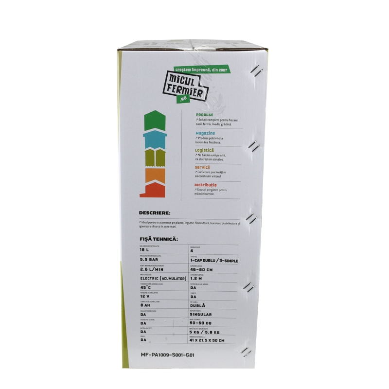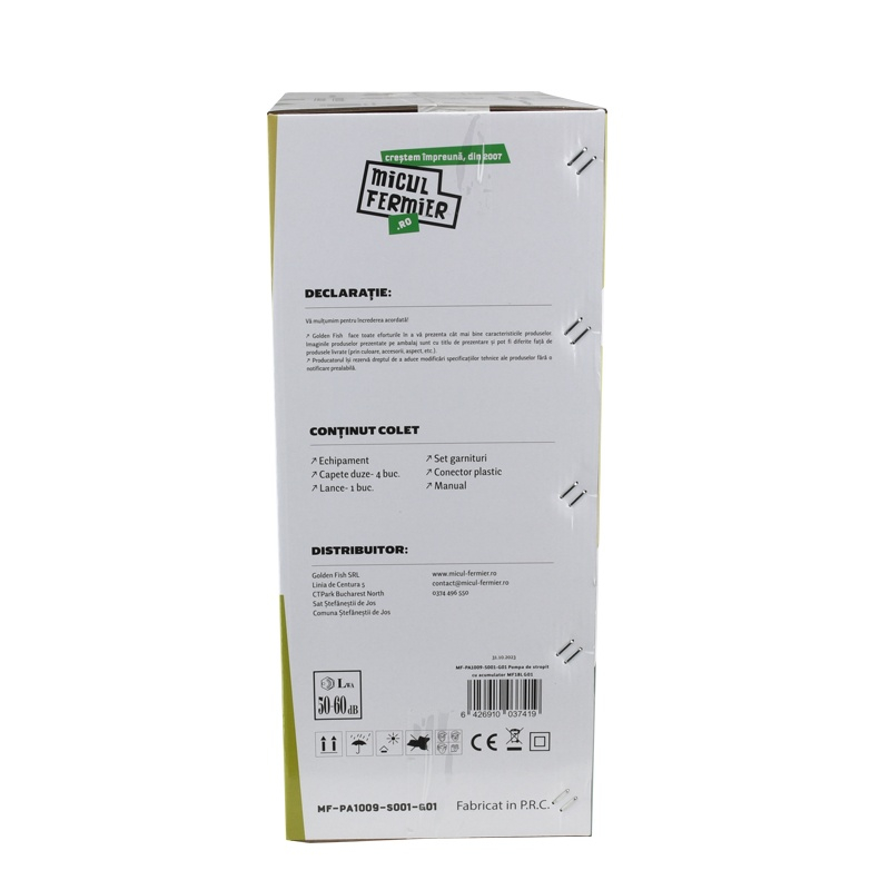 Pompă de stropit cu acumulator 18L – MF Pandora MF-PA1009-S001-G01 🌿🔋Pulverizare eficientă și confort maxim pentru grădina ta! Pompa de stropit MF Pandora MF-PA1009-S001-G01 este un echipament fiabil și ușor de utilizat, ideal pentru combaterea dăunătorilor, aplicarea îngrășămintelor lichide și dezinfectarea suprafețelor. Cu o capacitate de 18L și un acumulator puternic de 12V/8Ah, această pompă oferă pulverizare uniformă și autonomie extinsă pentru lucrări de lungă durată. 🔧 Caracteristici principale ✅ Capacitate rezervor: 18L – Ideală pentru gospodării, livezi, viță-de-vie și suprafețe agricole✅ Pulverizare uniformă și constantă – Efect nebulizator ridicat pentru acoperire eficientă✅ Acționare electrică – Funcționare fără efort datorită acumulatorului 12V/8Ah✅ Autonomie de până la 2,5 ore – Lucrezi fără întreruperi pentru rezultate rapide✅ Debit pulverizare: 2,6 L/min – Optimizat pentru consum eficient de soluție✅ Presiune maximă de lucru: 5,5 bar – Distribuire precisă și controlată a lichidelor✅ Lance telescopică din oțel inoxidabil (48-80 cm) – Reglabilă pentru acces ușor la orice suprafață✅ Duze interschimbabile – Se adaptează perfect pentru diverse tipuri de tratamente✅ Material rezervor: PP & ABS – Rezistent la uzură și substanțe chimice✅ Greutate redusă: 5 kg – Manevrabilitate ușoară și transport fără efort✅ Curea de umăr ergonomică tip rucsac – Benzi reglabile pentru distribuția uniformă a greutății✅ Timp de încărcare: 8-10 ore✅ Indicator LED pentru starea bateriei: Verde – Putere normală Galben – Putere redusă Roșu – Suprasarcină ✅ Regulator de presiune integrat – Control precis asupra debitului de pulverizare✅ Indicator LED pentru încărcare: LED roșu – Indică încărcarea în desfășurare LED verde – Indică baterie complet încărcată📌 Utilizări recomandate✔ Aplicare de pesticide și erbicide – Protejează culturile de boli și dăunători✔ Fertilizare cu îngrășăminte lichide – Asigură creșterea sănătoasă a plantelor✔ Pulverizare de detergenți – Curățare rapidă a geamurilor și a suprafețelor diverse✔ Udare cu apă de ploaie – Ideală pentru irigarea plantelor și florilor✔ Dezinsecție și dezinfectare – Recomandată pentru gospodării, ferme și spații comerciale 📌 Specificații tehnice 🔹 Capacitate rezervor: 18L🔹 Presiune maximă de lucru: 5,5 bar🔹 Debit pulverizare: 2,6 L/min🔹 Temperatură maximă lichid: 45°C🔹 Acționare pompă: Electrică cu acumulator🔹 Tip acumulator: 12V/8Ah, integrat🔹 Timp maxim de utilizare continuă: 2,5 ore🔹 Timp de încărcare acumulator: 8-10 ore🔹 Lungime furtun: 1,2 m🔹 Lungime lance telescopică: 48-80 cm🔹 Material lance: Oțel inoxidabil🔹 Nivel zgomot: 50-60 dB 💡 Beneficii pentru utilizator ✔ Design ergonomic – Confortabil și ușor de folosit datorită sistemului tip rucsac✔ Pulverizare fără efort – Funcționare automată pentru eficiență maximă✔ Consum optimizat de soluție – Aplicare uniformă și reducerea pierderilor✔ Autonomie extinsă – Permite lucru fără întreruperi timp îndelungat✔ Siguranță în utilizare – Ideală pentru zone umede sau sensibile 📦 Conținut colet ✔ Pompă de stropit cu acumulator 18L MF-PA1009-S001-G01✔ Lance telescopică din inox (48-80 cm)✔ 4 duze interschimbabile pentru diferite tipuri de pulverizare✔ Set garnituri de rezervă✔ Alimentator pentru încărcare baterie✔ Manual de utilizare✔ Cutie de transport🔋 Acumulator integrat – nu necesită baterii suplimentare! ⚠️ Atenție! Nu este permisă utilizarea pompei pentru pulverizarea următoarelor substanțe:❌ Substanțe chimice agresive din clase industriale❌ Substanțe explozive❌ Solvenți, substanțe caustice cu autoîncălzire❌ Substanțe corozive❌ Agenți de pulverizare care nu sunt aprobați pentru comercializare❌ Lucrări profesionale în spații publice, parcuri, stadioane sau silvicultură 🌿 Îngrijește-ți grădina rapid și eficient!